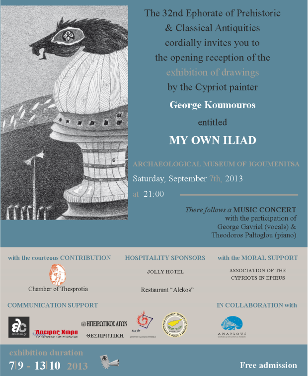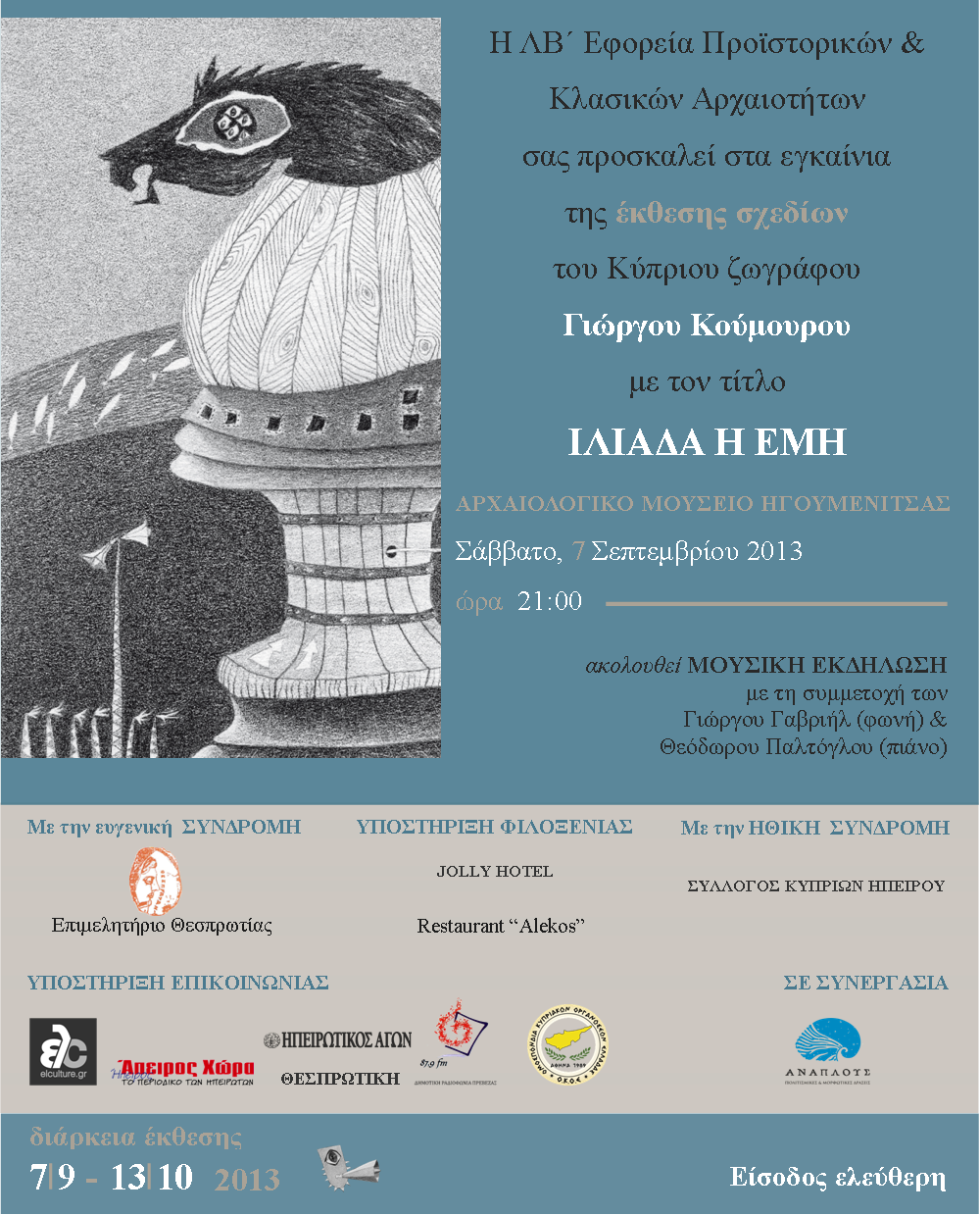 Γιώργος Κούμουρος: «Ιλιάδα η εμή»-Σταθμός 2ος- Αρχαιολογικό Μουσείο Ηγουμενίτσας (7/9 – 13/10/2013), σε διοργάνωση της ΛΒ΄ Ε.Π.Κ.Α.. 5 Σεπτεμβρίου 2013 Tags:Γιώργος Κούμουρος: "Ιλιάδα η εμή"-Σταθμός 2ος- Αρχαιολογικό Μουσείο Ηγουμενίτσας (7/9 - 13/10/2013)σε διοργάνωση της ΛΒ΄ Ε.Π.Κ.Α..