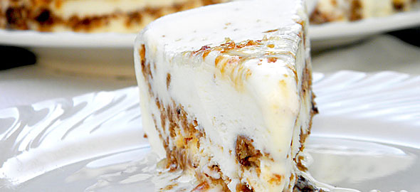 Χύνετε το παγωτό στο τσέρκι πάνω στην παγωμένη βάση. Βάζετε την τούρτα στην κατάψυξη.