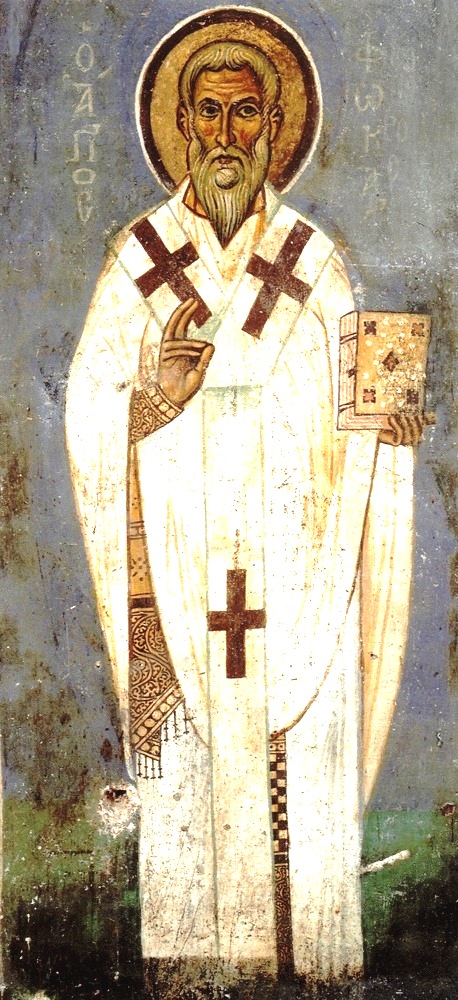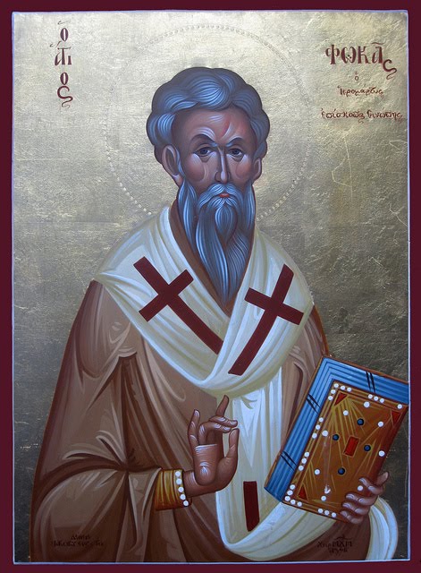 Ἐκ βρέφους τοῦ Πνεύματος, ὀφθεῖς δοχεῖον λαμπρόν, θαυμάτων ἐπλούτησας, τὴν παρ’ αὐτοῦ δωρεάν, Φωκὰ Ἱερώτατε, ὅθεν ἱερουργήσας, τῷ Σωτηρι ὁσίως, ἔπιες ἐν ἀθλήσει, τὸ ποτήριον τούτου, ὦ πρέσβευε δεόμεθα, ὑπὲρ τῶν ψυχῶν ἠμῶν.