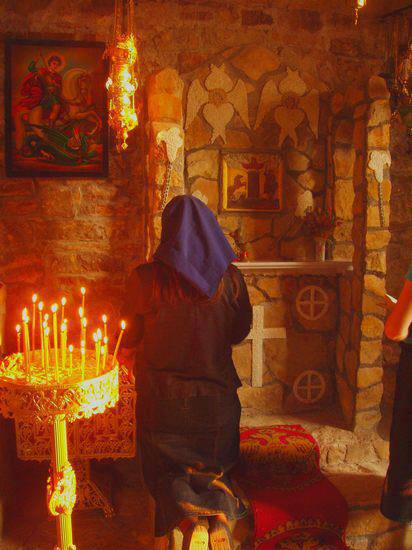 Στέκεται ακίνητη πλάι στο στασίδι της.