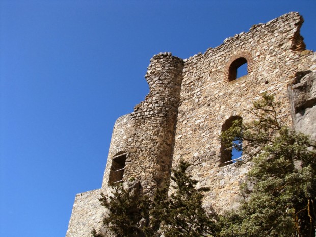 Αμέσως, στα δεξιά μας, προβάλλει η εκκλησία της Παναγίας της Αψινθιώτισσας. Θα τη δούμε στην επιστροφή. Μετά από μερικές ακόμη κορδέλλες του βουνού, σταματάμε σε ένα πλάτωμα, και από πάνω μας ακριβώς προβάλλει στην κορυφή των απότομων και πανύψηλων βράχων επιβλητικό το κατεστραμμένο κάστρο.