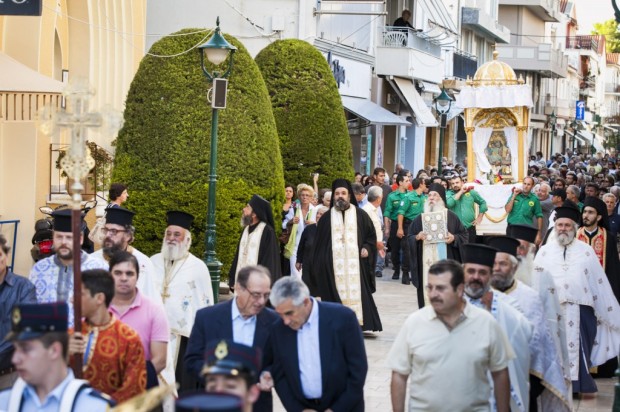 Συνοδεία της φιλαρμονικής του δήμου, ιεροψαλτών και κληρικών η Παναγία η Δραπανιώτισσα διέσχισε του δρόμους του Λιθόστρωτου, της παραλιακής και με ένα ρυμουλκό στολισμένο μεταφέρθηκε στο Δράπανο.