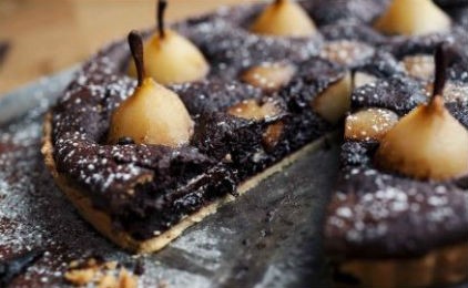Περιχύνετε τη γκανάς στο εσωτερικό της τάρτας και τέλος βάζετε από πάνω τις φέτες αχλαδιού.