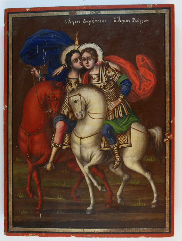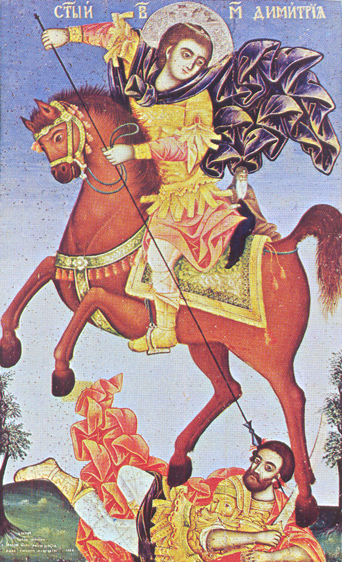 Στις βυζαντινές εικόνες αλλά και στη σύγχρονη αγιογραφία ο Άγιος Δημήτριος παρουσιάζεται αρκετές φορές ως καβαλάρης με κόκκινο άλογο (σε αντιδιαστολή του λευκού αλόγου του Αγίου Γεωργίου) να πατά τον άπιστο Λυαίο.