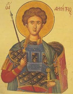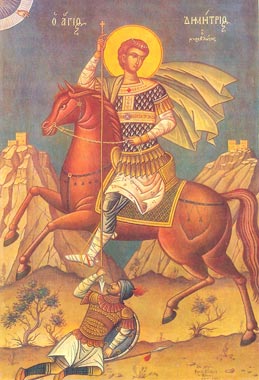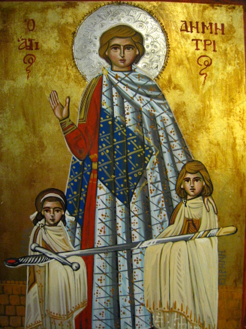Βασιλεί των αιώνων ευαρεστών, βασιλέως ανόμου πάσαν βουλήν, εξέκλινας Ένδοξε, και γλυπτοίς ουκ επέθυσας• δια τούτο θύμα, σαυτόν προσενήνοχας, τω τυθέντι Λογω αθλήσας στερρότατα• όθεν και τη λόγχη, την πλευράν εξωρύχθης, τα πάθη ιώμενος, των πιστώς προσιόντων σοι, Αθλοφόρε Δημήτριε, πρέσβευε Χριστώ τω Θεώ, των πταισμάτων άφεσιν δωρήσασθαι, τοις εορτάζουσι πόθω, την αγίαν μνήμην σου.