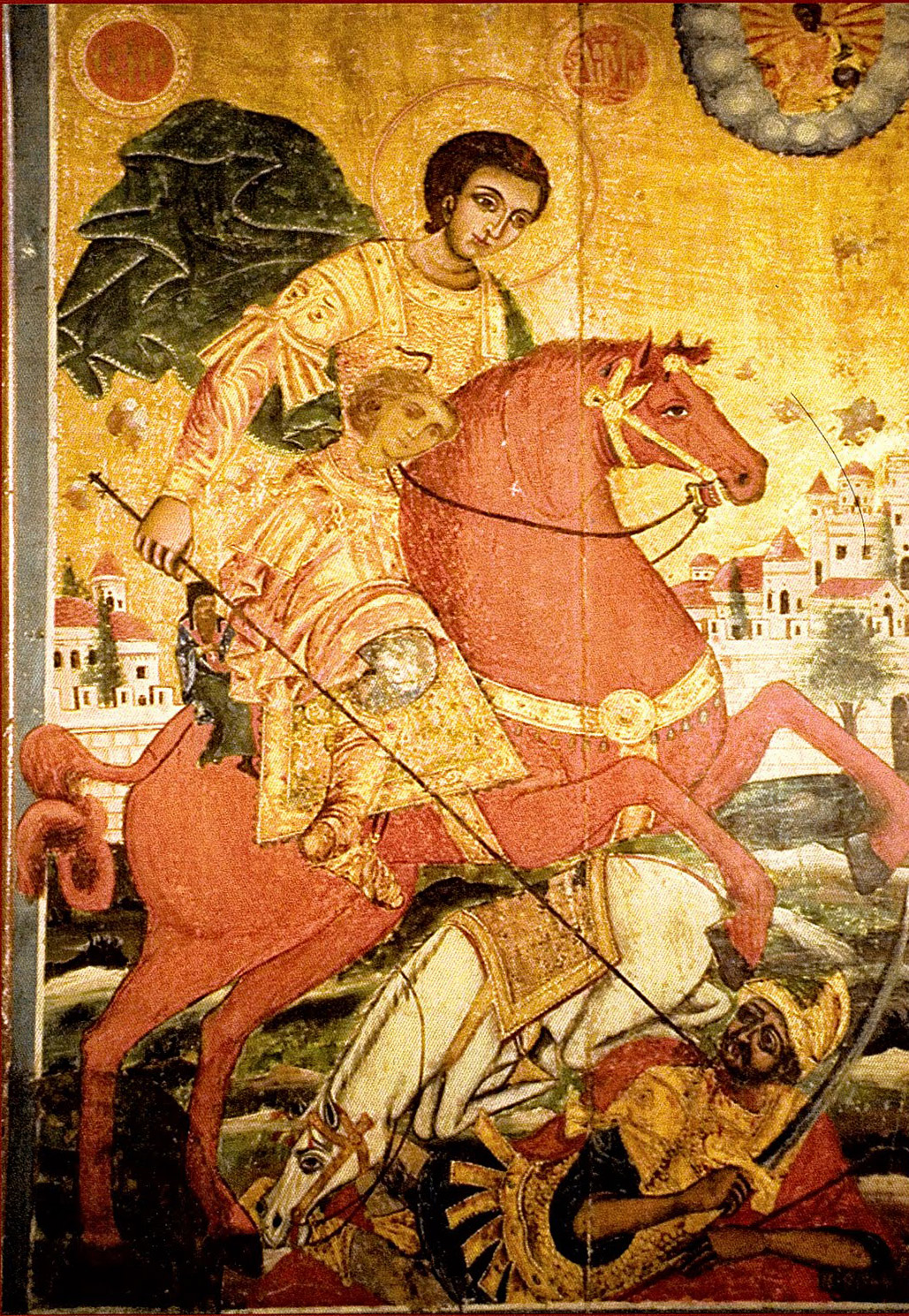 Το 1890 μ.Χ. όταν ήρθαν οι Βούλγαροι (κομιτατζήδες) καίγανε ή έβγαζαν τα μάτια του Αγ. Δημητρίου. Για να μην γίνει αυτό οι μοναχοί της μονής του Αγ. Γεωργίου Τριμορφου επιζωγράφησαν την εικόνα του Αγ. Γεωργίου πάνω στην εικόνα του Αγ. Δημητρίου. Αυτό ανακαλύφθηκε το 2000 μ.Χ. και στείλανε την παραπάνω εικόνα στο Παν. Θεσσαλονίκης, όπου έγινε η αποκατάσταση με την διαφορά ότι αφήσανε το κεφαλάκι του Αγ. Γεωργίου για να θυμόμαστε το γεγονός.