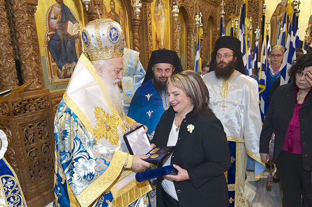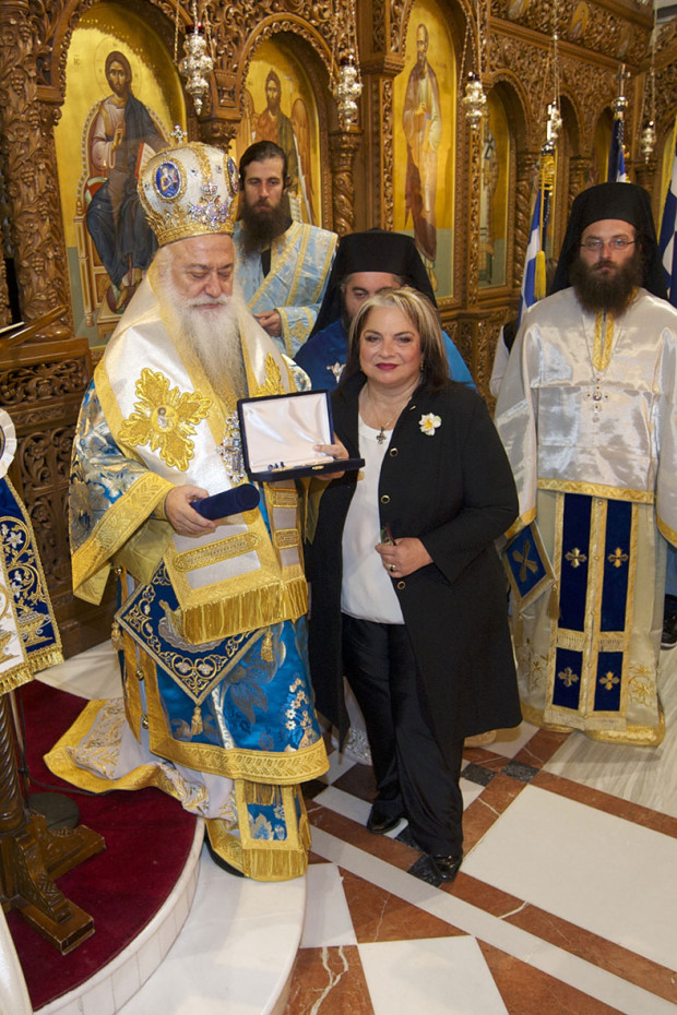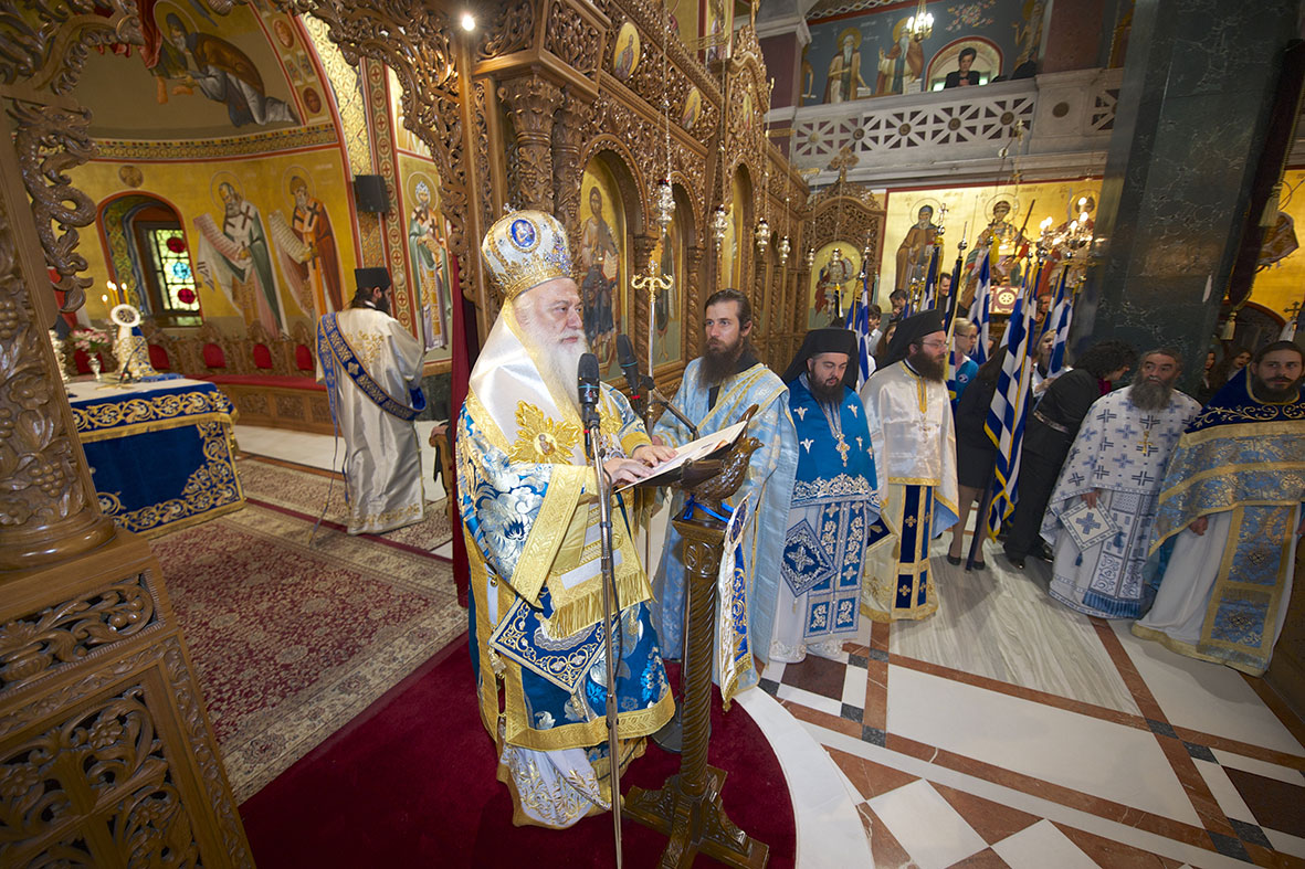 Με πολλή συγκίνηση αποδέχομαι την τιμητική διάκριση που μου απονέμετε κατά την επίσημη αυτή ημέρα της εθνικής εορτής ως μία απόδοση τιμής και σεβασμού όχι προς το πρόσωπό μου αλλά προς την Εκκλησία για την προσφορά της στην τοπική μας κοινωνία αλλά και το Γένος μας σε καιρούς ειρήνης και καιρούς πολέμου, τόσο στο παρελθόν όσο και σήμερα.