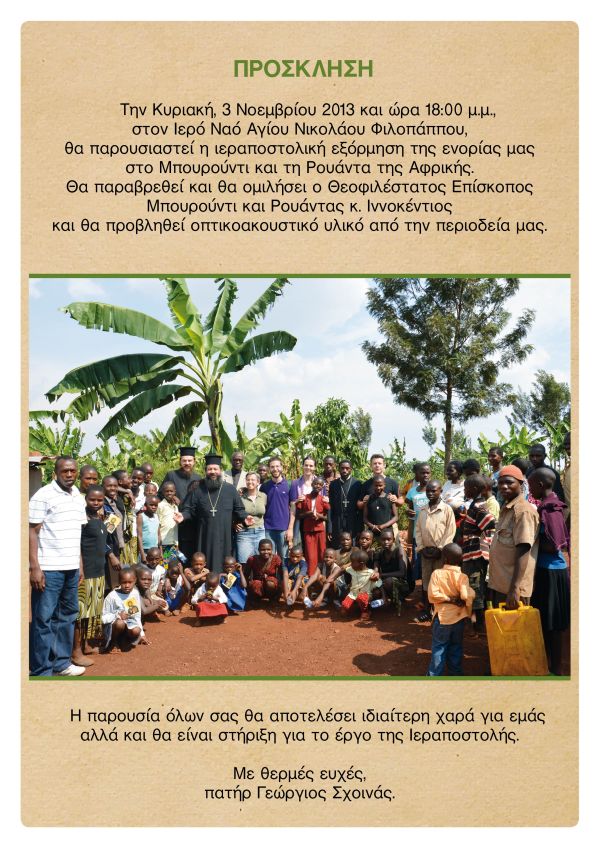 Την προσεχή Κυριακή 3 Νοεμβρίου στον Ιερό Ναό Αγίου Νικολάου Φιλοπάππου θα παρουσιαστεί η ιεραποστολική εξόρμηση της ενορίας στο Μπουρούντι και στη Ρουάντα Αφρικής.