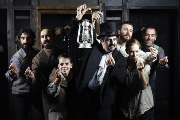 Είναι η πρώτη φορά που το διήγημα αυτό ανεβαίνει στο θέατρο. Κι αν κάτι μας αποδεικνύει, είναι πως η θεατρικότητα είναι μέρος της λογοτεχνικής συνείδησης του «αγίου των ελληνικών γραμμάτων». Στην παράσταση δεν υπάρχει αφηγητής. Οι ηθοποιοί (Ελισσαίος Βλάχος, Παύλος Εμμανουηλίδης, Ροζαμάλια Κυρίου, Αγγελική Μαρίνου, Δημοσθένης Ξυλαρδιστός, Κώστας Παπακωνσταντίνου και Παναγιώτης Σούλης) είναι εκείνοι που επωμίζονται και τα αφηγηματικά και τα διαλογικά μέρη. Με ρυθμό και ζωντάνια κινούνται ανάμεσα στο λιτό ευρηματικό (υπέροχη ιδέα τα τραπέζια που ορθωμένα γίνονται πόρτες που ανοίγουν) κι ευέλικτο σκηνικό χώρο (σκηνικά- κοστούμια Λυδίας Κοντογιώργη) σκηνοθετημένοι με κέφι και φαντασία από τον Κώστα Παπακωνσταντίνου.