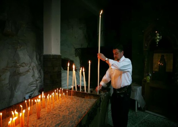Ανάβοντας κερί στο Ιερό Αγίασμα της Αγίας Μεγαλομάρτυρος Παρασκευής στα Τέμπη.