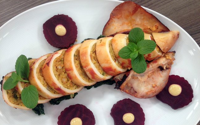 Καλαμάρι γεμιστό με πλιγούρι, γαρίδες, φινόκιο, σαφράν, τριλογία από πιπεριές φλαμπαρισμένο με λευκή σαμπούκα. Γαρνιρισμένο με σπανάκι σωτέ και ροζέτες παντζαριού.