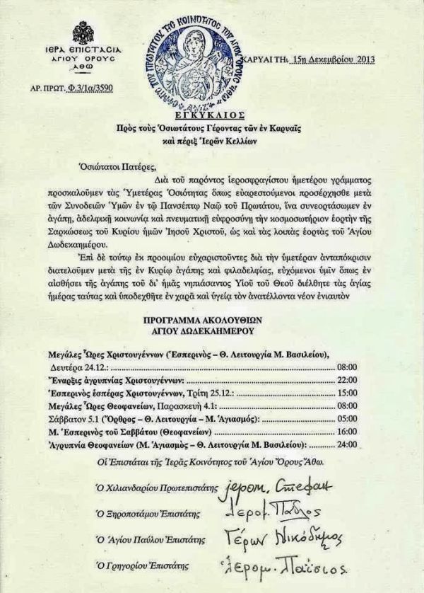 Η Εγκύκλιος της Ιεράς Επιστασίας προς τους Κελλιώτες Γέροντες της περιοχής των Καρυών, με το πρόγραμμα των Ακολουθιών του Αγίου Δωδεκαημέρου, το διάστημα 25/12-6/1 (σύμφωνα με το νέο ημερολόγιο, 7/1-19/1/2013), στον Πάνσεπτο Ιερό Ναό του Πρωτάτου έχει ως εξής: