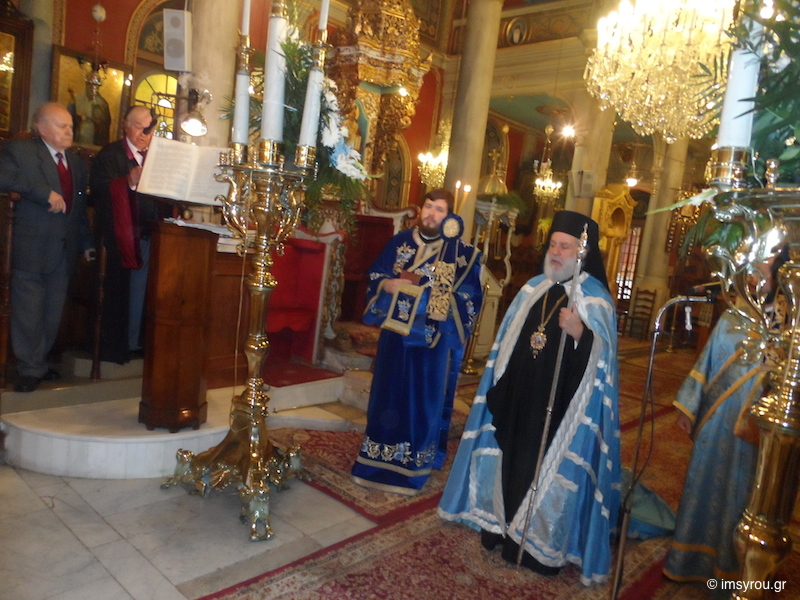 Εν συνεχεία τέλεσε την Ακολουθία του Μεγάλου Αγιασμού και αμέσως μετά σχηματίστηκε κατά την εκκλησιαστική τάξη Λιτανευτική πομπή, με τη συμμετοχή του ιερού Κλήρου της νήσου, προπορευομένης της Φιλαρμονικής του Δήμου Σύρου-Ερμούπολης, την οποία ακολούθησαν ο Βουλευτής Κυκλάδων κ. Παν. Ρήγας, ο Δήμαρχος Σύρου Ερμούπολης κ. Ιω. Δεκαβάλλας, ο Χωρικός Αντιπεριφερειάρχης Κυκλάδων κ.Γ. Πουσσαίος, εκπρόσωποι των τοπικών Αρχών, του Στρατού, του Ναυτικού, των Σωμάτων Ασφαλείας και του Λιμενικού Σώματος, Περιφερειακοί και Δημοτικοί Σύμβουλοι, ο Κυβερνήτης της τιμητικά και κατόπιν αδείας του Αρχηγού Στόλου προσορμισθείσης στον λιμένα της Ερμούπολης Πυραυλακάτου του Π.Ν.»ΓΡΗΓΟΡΟΠΟΥΛΟΣ», , Αξιωματικοί και στελέχη του Λιμεναρχείου Σύρου, Σπουδαστές της Ναυτικής Ακαδημίας Σύρου, μέλη του Λυκείου Ελληνίδων και του Σώματος Προσκόπων, Ναυτοπροσκόπων και Οδηγών, καθώς και πλήθους πιστού λαού.