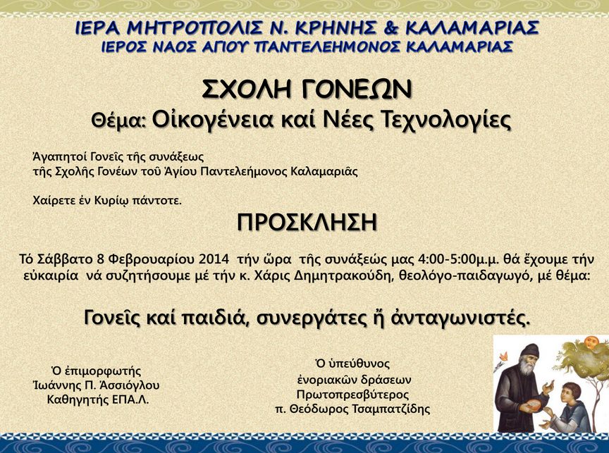 Πρόσκληση, σχολή γονέων Ιερός Ναός Αγίου Παντελεήμονος Καλαμαριάς , κ.Χ. Δημητρακούδη – Σάββατο 08 Φεβρουάριου 2014