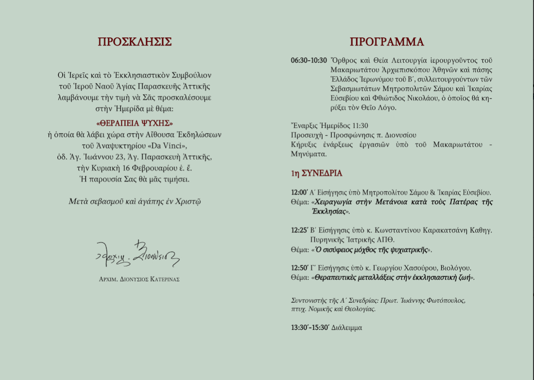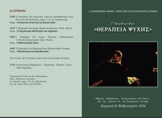 ΤΟ ΠΡΟΓΡΑΜΜΑ ΤΗΣ Γ΄ΗΜΕΡΙΔΟΣ ΤΗΣ ΕΝΟΡΙΑΣ ΤΗΣ ΑΓΙΑΣ ΠΑΡΑΣΚΕΥΗΣ ΑΤΤΙΚΗΣ ΜΕ ΘΕΜΑ «ΘΕΡΑΠΕΙΑ ΤΗΣ ΨΥΧΗΣ» ΠΟΥ ΘΑ ΠΡΑΓΜΑΤΟΠΟΙΗΘΕΙ ΤΗΝ ΚΥΡΙΑΚΗ 16 ΦΕΒΡΟΥΑΡΙΟΥ 2014 ΣΤΗΝ ΑΓΙΑ ΠΑΡΑΣΚΕΥΗ ΚΑΙ ΤΗΝ ΑΙΘΟΥΣΑ ΕΚΔΗΛΩΣΕΩΝ ΤΟΥ ΑΝΑΨΥΚΤΗΡΙΟΥ «DA VINCI» ME THN ΣΕΠΤΗ ΕΥΛΟΓΙΑ ΤΟΥ ΜΑΚΑΡΙΩΤΑΤΟΥ ΑΡΧΙΕΠΙΣΚΟΠΟΥ ΑΘΗΝΩΝ ΚΑΙ ΠΑΣΗΣ ΕΛΛΑΔΟΣ Κ.Κ. ΙΕΡΩΝΥΜΟΥ ΤΟΥ Β΄