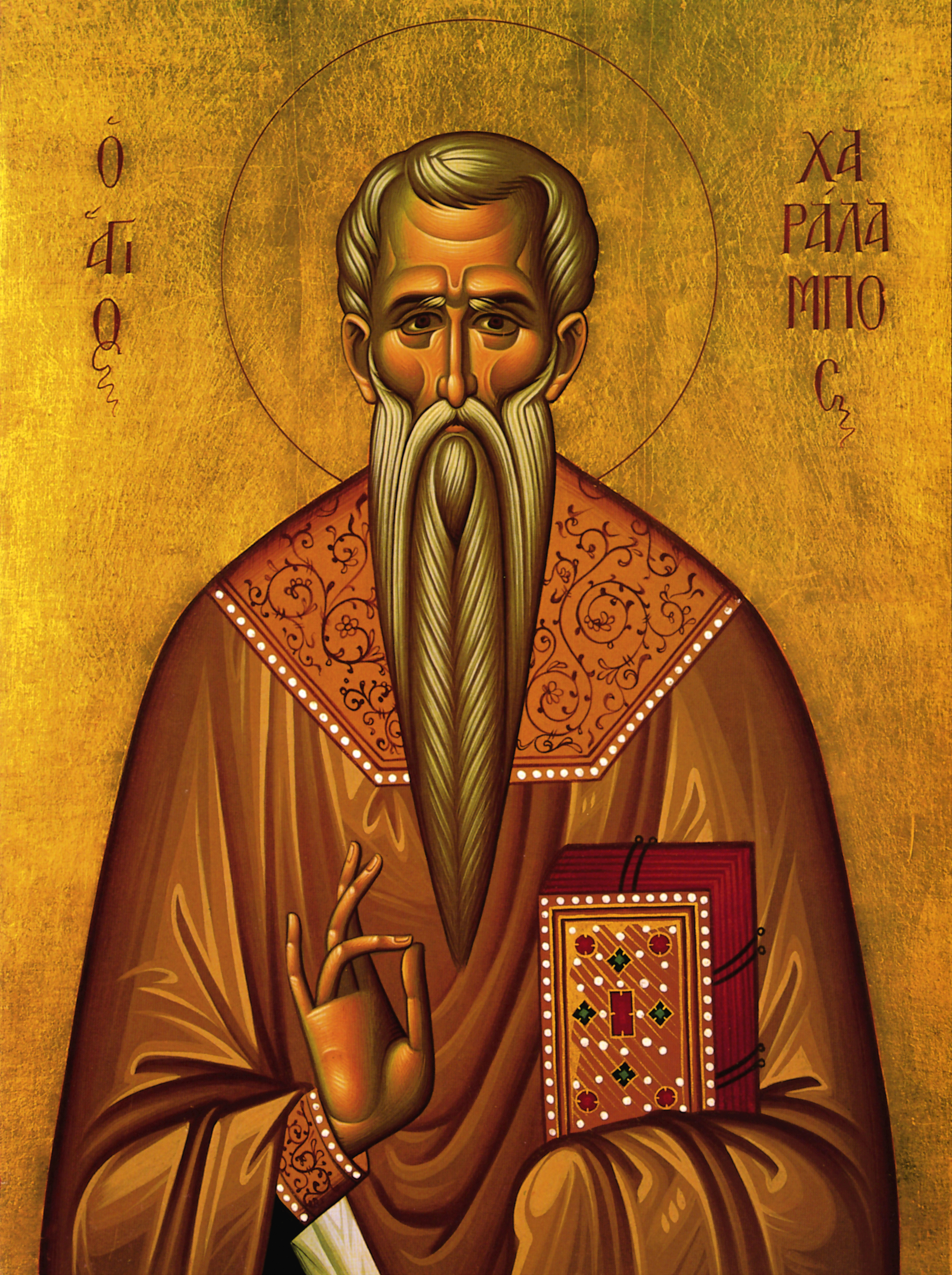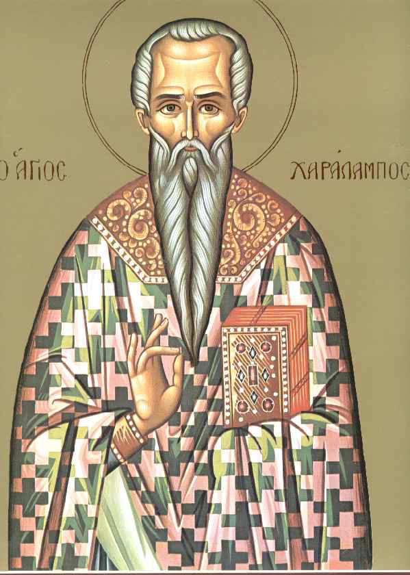 Τὸν στερρὸν ὁπλίτην, καὶ Χριστοῦ στρατιώτην καὶ μέγαν ἐν Μάρτυσι, Χαραλάμπη τὸν πανένδοξον, συνελθόντες εὐφημήσωμεν· ὑπὲρ Χριστοῦ γὰρ καὶ τῆς ἀληθείας λαμπρῶς ἠγωνίσατο, καὶ τὴν ὀρθόδοξον πίστιν τρανῶς ἀνεκήρυξε, τὴν πλάνην τῶν εἰδώλων κατήργησε, βασιλέα παρανομώτατον ἤλεγξε, καὶ τὴν κάραν ἐτμήθη, χαίρων καὶ ἀγαλλόμενος· διὸ καὶ τὸν στέφανον εἴληφε παρὰ τῆς δεξιᾶς τοῦ Ὑψίστου, καὶ συμπολίτης Ἀγγέλων ἐγένετο. Ὅθεν ἡ Ἐκκλησία τῶν Ὀρθοδόξων, τούτου τὴν πάντιμον κάραν κατασπαζομένη, καὶ εὐφημίαις καταστέφουσα, καὶ πολλῶν δεινῶν καὶ νόσων ἀπαλλαττομένη, χαίρει τὸν Κτίστην δοξάζουσα.