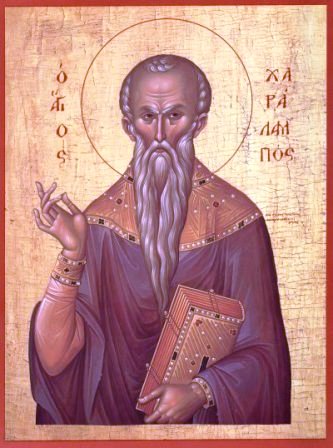 Ο Άγιος Χαράλαμπος ήταν ιερεύς στη Μαγνησία της Μικράς Ασίας και έζησε επί αυτοκρατορίας του Σεπτιμίου Σεβήρου (193 – 211 μ.Χ.). Όταν το έτος 198 μ.Χ. ο Σέβηρος εξαπέλυσε απηνή διωγμό κατά των Χριστιανών, ο έπαρχος της Μαγνησίας Λουκιανός, συνέλαβε τον Άγιο και του ζήτησε να αρνηθεί την πίστη του. Όμως ο Άγιος όχι μόνο δεν το έκανε αυτό, αλλά αντίθετα ομολόγησε στον έπαρχο την προσήλωσή του στον Χριστό και δήλωσε με παρρησία ότι σε οποιοδήποτε βασανιστήριο και να υποβληθεί δεν πρόκειται να αρνηθεί την πίστη της Εκκλησίας. Τότε η σκοτισμένη και σαρκική ψυχή του Λουκιανού επέτεινε την οργή της και διέταξε να αρχίσουν τα φρικώδη βασανιστήρια στο γέροντα ιερέα. Πρώτα τον γύμνωσαν και ο ίδιος ο Λουκιανός, παίρνοντας το ξίφος του προσπάθησε να πληγώσει το σώμα του Αγίου. Όμως αποκόπηκαν τα χέρια του και έμειναν κρεμασμένα στο σώμα του Ιερομάρτυρα και μόνο ύστερα από προσευχή του Αγίου συγκολλήθηκαν αυτά πάλι στο σώμα και ο ηγεμόνας κατέστη υγιής. Βλέποντας αυτό το θαύμα του Αγίου πολλοί από τους δημίους πίστεψαν στον αληθινό Θεό.