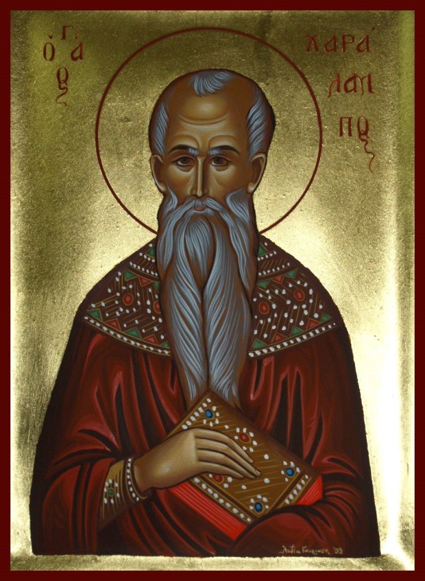 Ὡς στύλος ἀκλόνητος, τῆς Ἐκκλησίας Χριστοῦ, καί λύχνος ἀείφωτος τῆς οἰκουμένης σοφέ, ἐδείχθης Χαράλαμπες· ἔλαμψας ἐν τῷ κόσμῳ, διά τοῦ μαρτυρίου, ἔλυσας τῶν εἰδώλων, τήν σκοτόμαιναν μάκαρ, διό ἐν παρρησίᾳ Χριστῷ, πρέσβευε σωθῆναι ἡμᾶς.