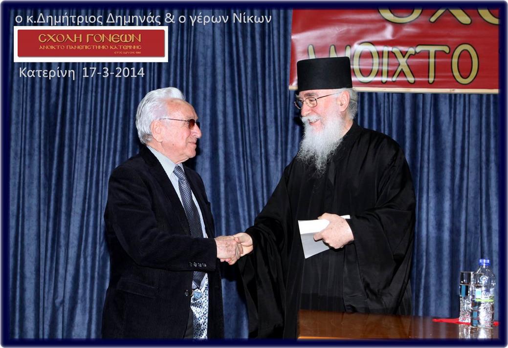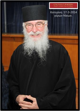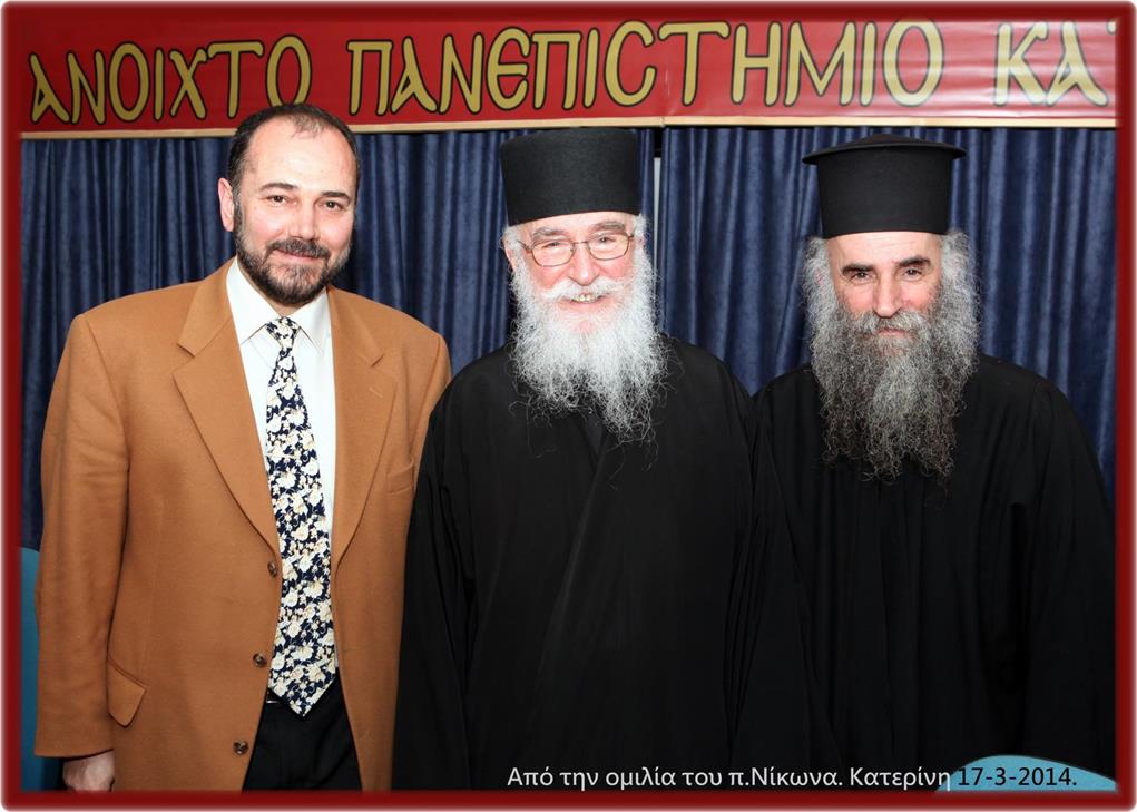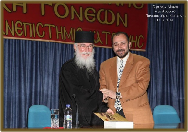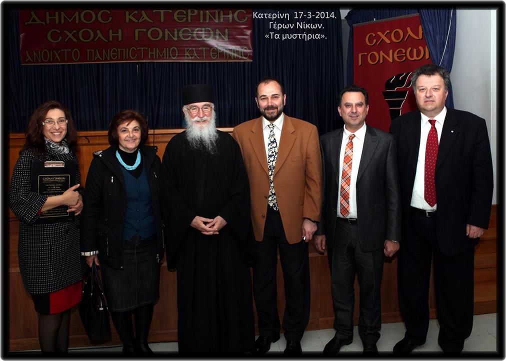 Τη Δευτέρα 17 Μαρτίου 2014 η Σχολή Γονέων-Ανοικτό Πανεπιστήμιο Κατερίνης είχε ως ομιλητή το γέροντα Νίκωνα, μοναχό Νέας Σκήτης Αγίου Όρους, με θέμα » Τα Μυστήρια» στο Συνεδριακό Κέντρο του δήμου Κατερίνης.
