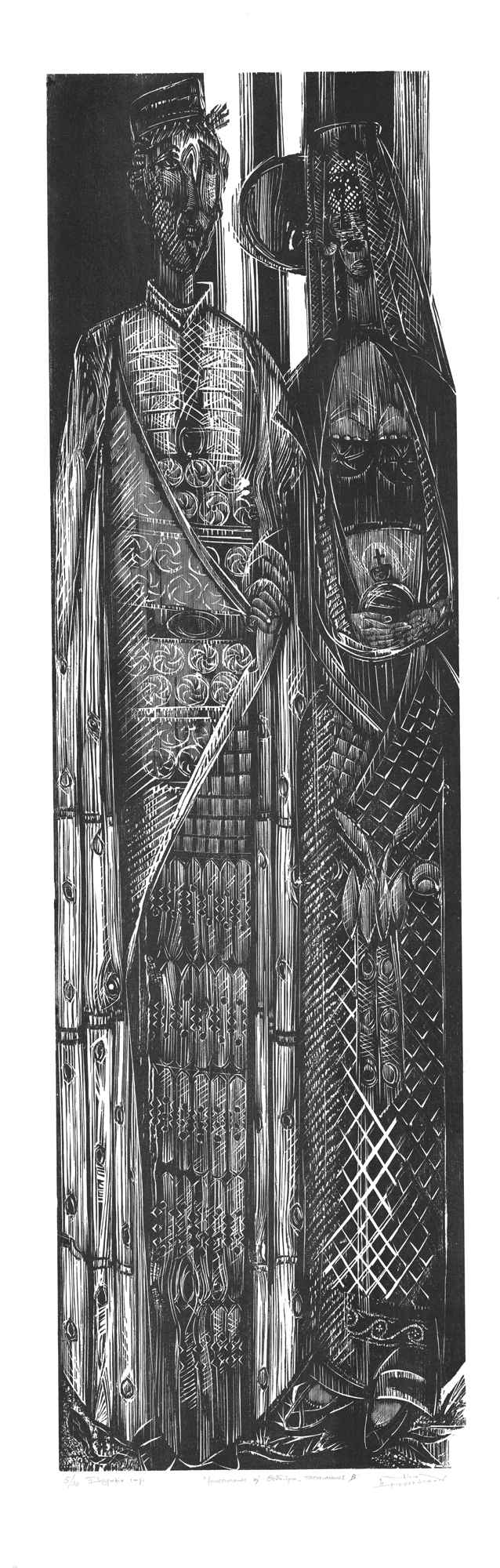 Κι εκεί, στη διάρκεια της πάλης σώμα με σώμα με τα ξύλα και τις ιδέες, προέκυψαν οι καινούργιες ξυλογραφίες μεγάλου μεγέθους. Τόσο μεγάλες, 170Χ50 εκ., που αναγκάστηκε να παραγγείλει χαρτί από τη Γερμανία. Καταπιανόταν χρόνια τώρα με διάφορες ενότητες, τη λαϊκή αρχιτεκτονική, το ελληνικό καφενείο, τις βάρκες και τα άλλα σκαριά. Ηθελε όμως να περάσει κάποια στιγμή από τη σιλουέτα των πραγμάτων στο περίγραμμα των σωμάτων. Αυτή είναι η πρόκληση για κάθε καλλιτέχνη. Και εκείνη τη στιγμή είδε τα γλυπτά του Θεόδωρου Παπαγιάννη: «Οσο κι αν φανεί τολμηρό, μέσα από αυτή την προσέγγιση αντιλήφθηκα ότι σε μια σύντομη αναδρομή στη γλυπτική τέχνη, στα κυκλαδικά ειδώλια, τα γλυπτά του Φειδία, του Μιχαήλ Αγγέλου, του Ροντέν, του Χένρι Μουρ, οι μορφές του Παπαγιάννη είναι μια αυθεντική προσωπική πρόταση, με ανεξάρτητη από επιρροές γλυπτική πορεία. Τα καθαρά περιγράμματα, η πληθώρα των υλικών που δημιουργεί γραμμικά στοιχεία και ενδιαφέρουσες ματιέρες, ήταν πρόκληση για μελέτη».