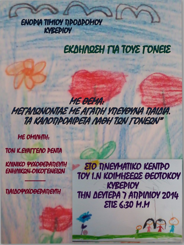 Τα καλοπροαίρετα λάθη των γονέων». Μετά το τέλος της ομιλίας θα ακολουθήσει συζήτηση.