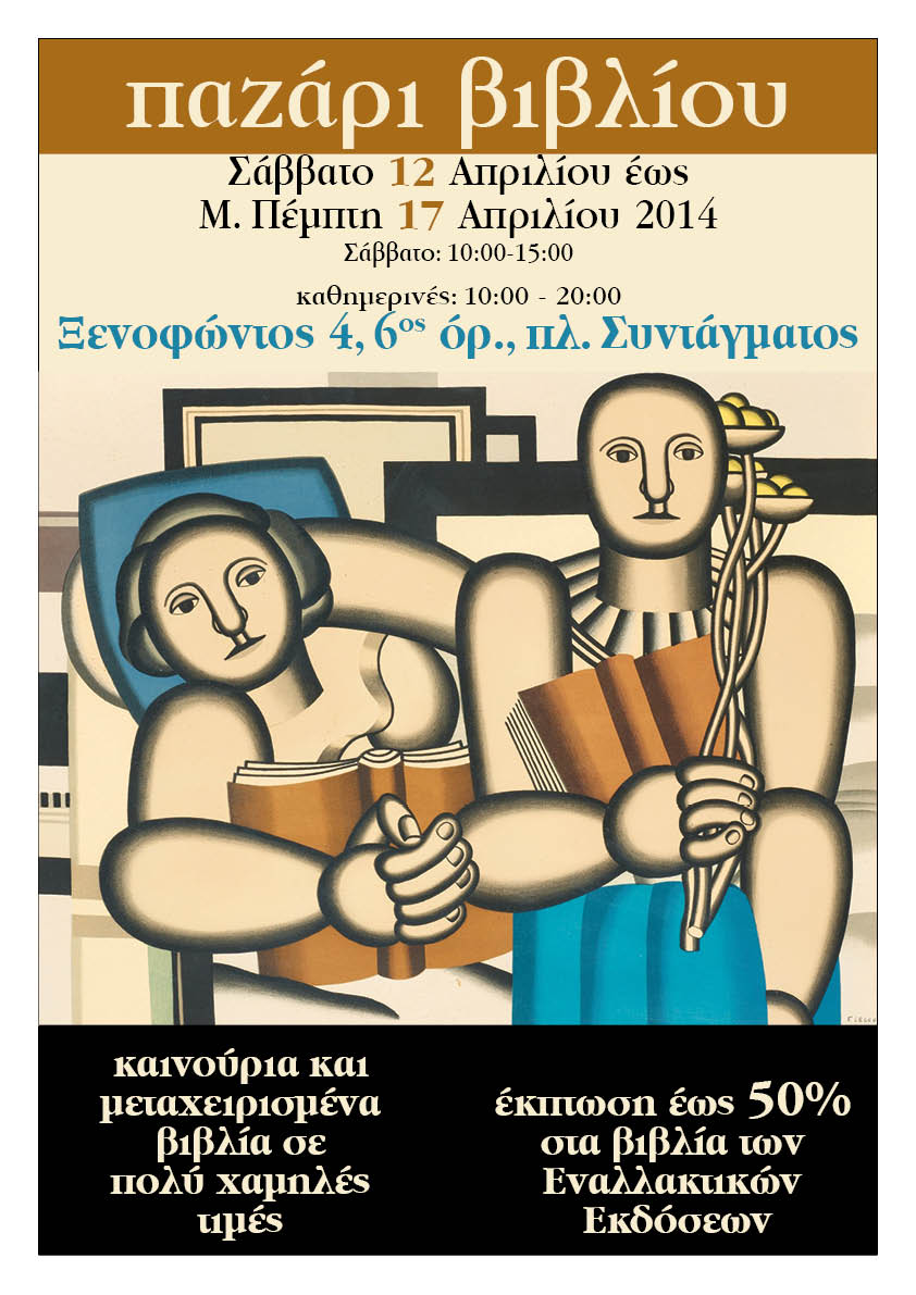 Ο Χώρος Πολιτισμού και Πολιτικής του Άρδην διοργανώνει από το Σάββατο 12 Απριλίου έως και τη Μ. Πέμπτη 17 Απριλίου παζάρι βιβλίου με καινούρια και μεταχειρισμένα βιβλία σε πολύ χαμηλές τιμές. Όλα τα βιβλία των Εναλλακτικών Εκδόσεων θα τα βρείτε με έκπτωση έως 50%, αλλά και μεταχειρισμένα βιβλία που θα ξεκινούν από 1 ευρώ. Το παζάρι θα λειτουργεί το Σάββατο από τις 10.00 έως τις 15.00 και τις καθημερινές από τις 10.00 έως τις 20.00.