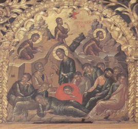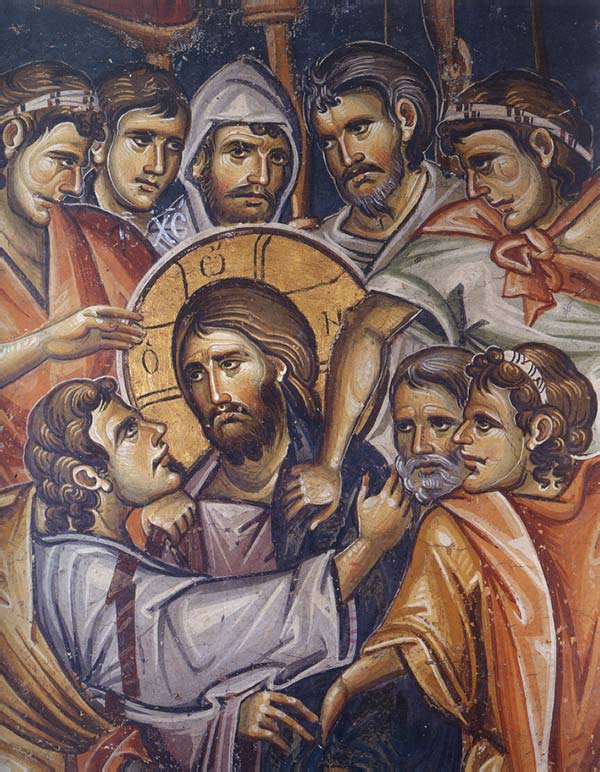 Μετά το δείπνο βγήκαν όλοι στο όρος των Ελαιών, όπου ο Χριστός τους δίδαξε τα ανήκουστα και τελευταία μαθήματα και αρχίζει να λυπάται και να ανυπομονεί. Αναχωρεό μόνος Του και, γονατίζοντας, προσεύχεται εκτενώς. Από την πολλή αγωνία γίνεται ο ιδρώτας Του σαν σταγόνες πηχτού αίματος, οι οποίες έπεφταν στη γη. Μόλις συμπληρώνει την εναγώνια εκείνη προσευχή, φθάνει ο Ιούδας με ένοπλους στρατιώτες και πολύ όχλο και αφού χαιρετάει και φιλάει πονηρά το δάσκαλό Του, Τον παραδίδει.