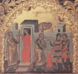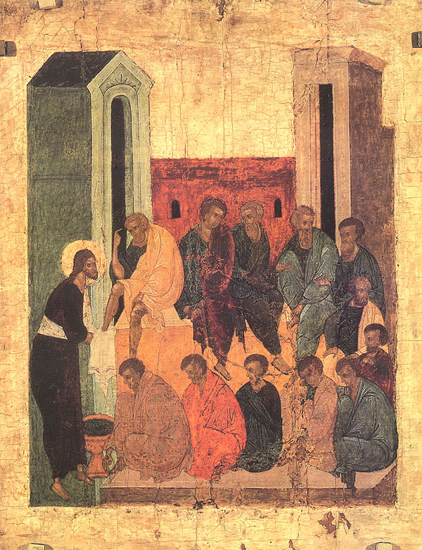 Πρώτα πήγε στον Ιούδα και μετά στό Πέτρο, ο οποίος ήταν ο πιο ορμητικός απ’ όλους και στην αρχή σταματάει το Διδάσκαλο, αλλά ύστερα όταν τον έλεγξε, υποχωρεί με τη καρδιά του. Αφού έπλυνε τα πόδια όλων, πήρε τα ιμάτιά Του και ξανακάθησε.