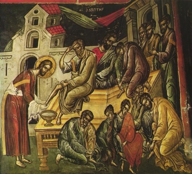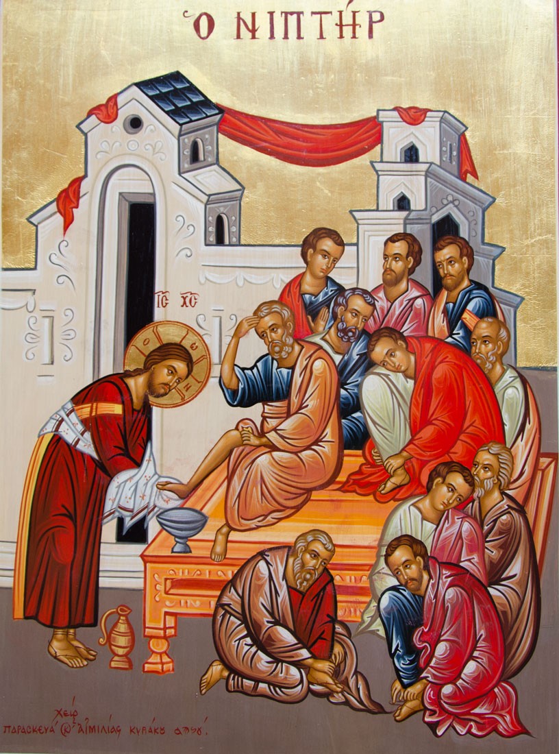 Εκείνο το βράδυ της Πέμπτης, πριν ν’ αρχίσει το δείπνο ο Ιησούς σηκώνεται από το τραπέζι, αφήνει κάτω τα ιμάτιά του, βάζει νερό στο νιπτήρα και τα κάνει όλα μόνος Του, πλένοντας τα πόδια των Μαθητών Του. Με τον τρόπο αυτό θέλει να δείξει σ’ όλους ότι δεν πρέπει να επιζητούμε τα πρωτεία. Μετά τη νίψη των ποδιών λέγει: «όποιος θέλει να είναι πρώτος, να είναι τελευταίος απ’ όλους».