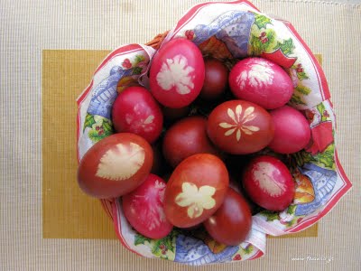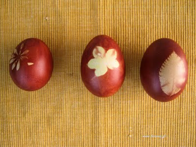 Φυσικά και μπορούμε να κάνουμε και σχέδια στα αυγά μας με διάφορα φυλλαράκια αρκεί να είναι πλατιά,τυλίγοντας τα με τούλι.