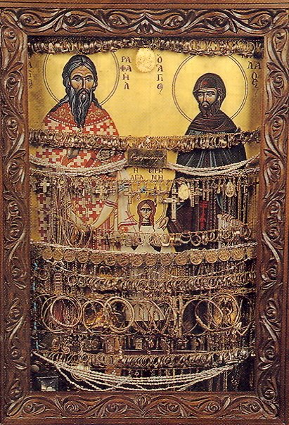 Πάντας τους προστρέχοντας ευλαβώς, υμών τη πρεσβεία, πάσης ρύσασθε συμφοράς, Ραφαήλ Ειρήνη, ομού συν Νικολάω, την των πταισμάτων λύσιν, ημίν αιτούμενοι.