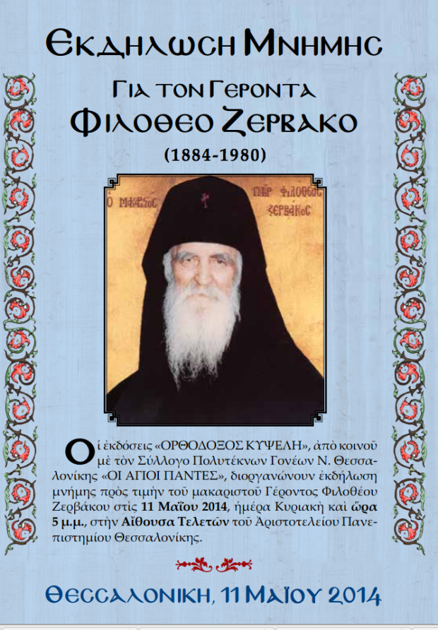 Εκδήλωση προς τιμήν του γέροντος Φιλοθέου Ζερβάκου. 3 Μαΐου 2014 Πρόγραμμα για την εκδήλωση προς τιμήν του γέροντος Φιλοθέου Ζερβάκου. Θα πραγματοποιηθεί την Κυριακή 11 Μαϊου 2014. Δείτε το πρόγραμμα εδώ Tags:Εκδήλωση προς τιμήν του γέροντος Φιλοθέου Ζερβάκου.