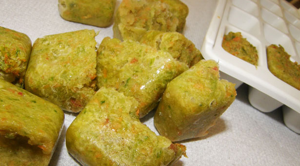 Κόβουμε τα λαχανικά σε κομμάτια και τα βράζουμε σε λίγο νερό, μέχρι να μαλακώσουν. Στη συνέχεια τα αλέθουμε στο μίξερ μαζί με το ζουμί τους, τα τοποθετούμε σε παγοθήκες και τα φυλάμε στην κατάψυξη.