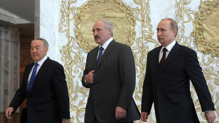 Από δεξιά προς τα αριστερά οι πρόεδροι της Ρωσίας, Βλαντιμίρ Πούτιν, της Λευκορωσίας, Αλεξάντρ Λουκασένκο και του Καζαχστάν, Νουσουρλτάν Ναζαρμπάγιεφ. Φωτ.: news.yahoo.com – AP Photo/RIA-Novosti, Alexei Druzhinin, Presidential Press Service
