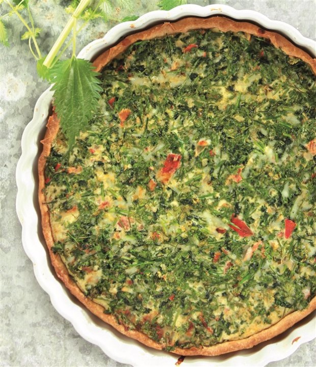 Στον κάδο του μίξερ ρίχνω 100 γρ. γιαούρτι, 100 γρ. βούτυρο και 200 γρ. αλεύρι σκληρό και χτυπάω τα υλικά με τον γάντζο, μέχρις ότου σχηματιστεί μια λεία και μαλακή ζύμη. Την αφήνω σκεπασμένη να «ξεκουραστεί», για περίπου 30 λεπτά. Σε ένα μεγάλο τηγάνι με ελάχιστο έ.π. ελαιόλαδο, σε μέτρια φωτιά, σοτάρω 1 κρεμμύδι, ψιλοκομμένο, και προσθέτω 3 ματσάκια τσουκνίδα και 5 ματσάκια μυρώνια, καλά πλυμένα και χονδροκομμένα. Ρίχνω 2 ντομάτες, κομμένες σε κυβάκια, και συνεχίζω το σοτάρισμα για λίγα λεπτά ακόμη, ώσπου να μαραθούν τα υλικά.