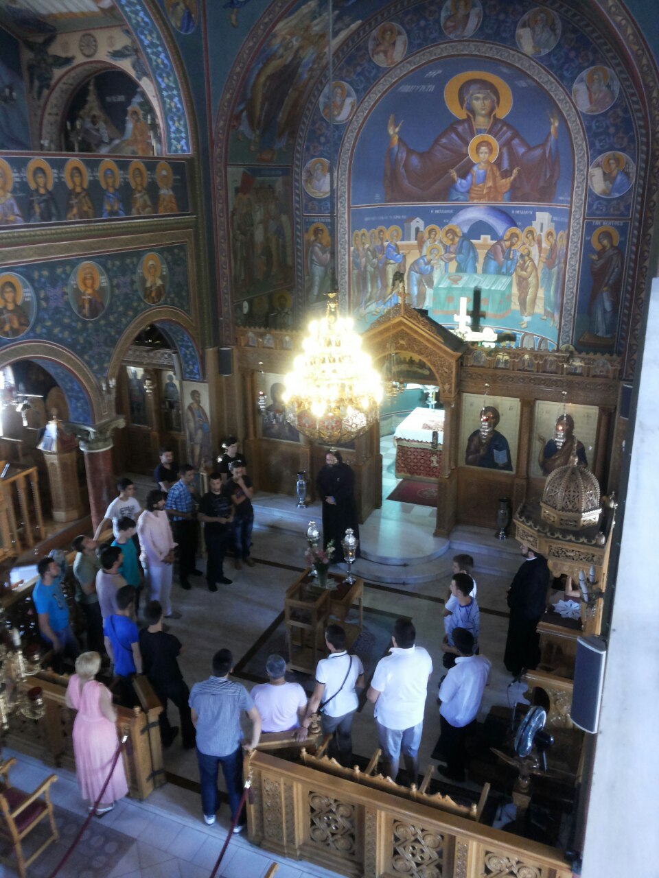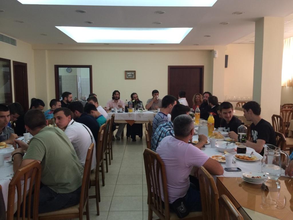 Αφού τους έγινε σύντομη ενημέρωση για το ιστορικό του Ναού και τις δράσεις της κοινότητας, ξεναγήθηκαν στους χώρους και παρακάθισαν με τους συνοδούς τους Καθηγητές και τον Σέρβο κληρικό πατέρα Σάσα Στανόγιεβιτς σε γεύμα που προετοίμασαν εθελόντριες κυρίες της ενορίας.