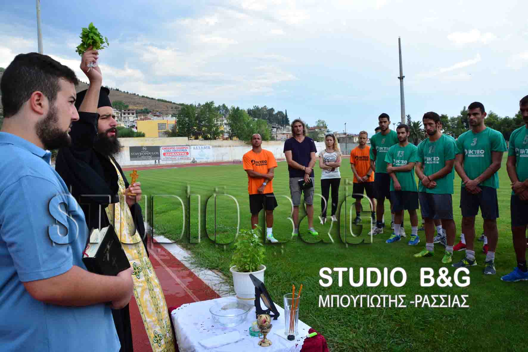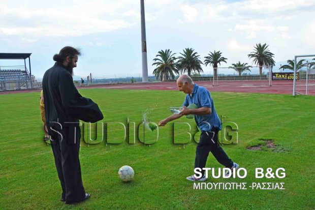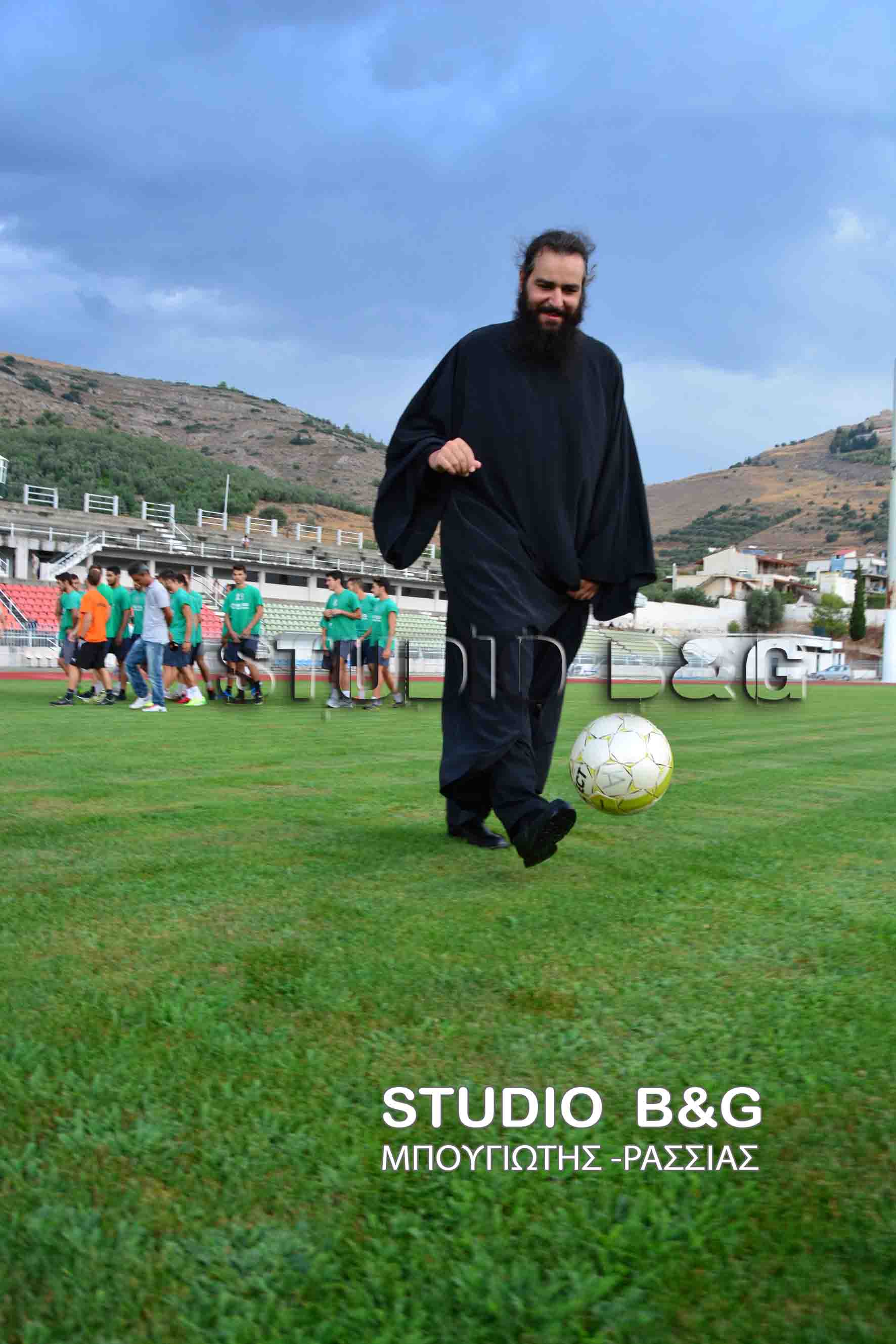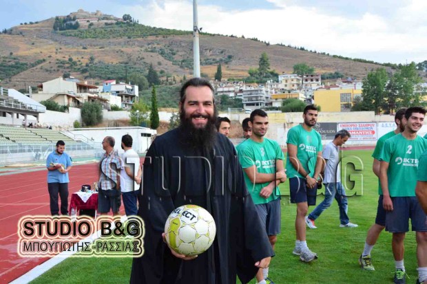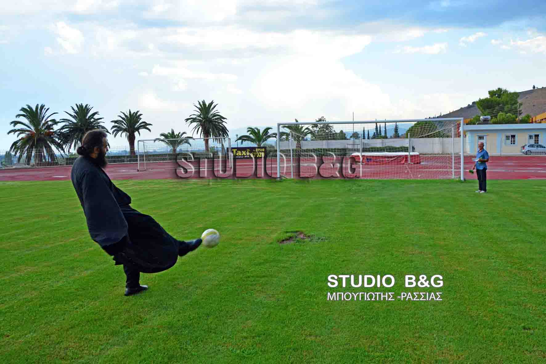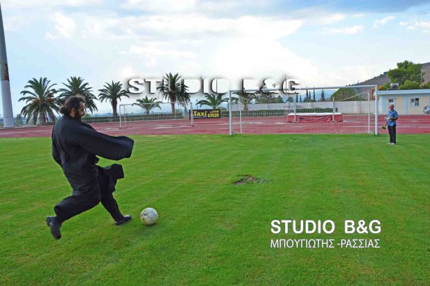 Ο ιερέας πατέρας Βασίλειος Δέδες από το Αργος σκοράρει στο τέρμα της ομάδας του Άργους ,Παναργειακό, Τετάρτη 6 Αυγούστου 2014. Ο ιερέας κάθε χρόνο τελεί τον αγιασμό της ομάδας και για γούρι ,για να πάει καλά η ομάδα του Άργους σκοράρει στα δίχτυα της.