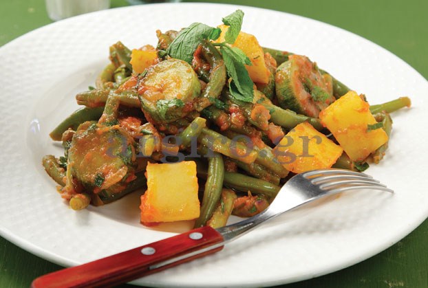 Καθαρίζουμε τα φασολάκια, τα πλένουμε και τα στραγγίζουμε. Κόβουμε τις πατάτες σε μεγάλα κομμάτια και τα κολοκύθια σε χοντρές φέτες. Ζεσταίνουμε το μισό ελαιόλαδο σε πλασοτέ κατσαρόλα. Αφήνουμε το ψιλοκομμένο κρεμμύδι για λίγα λεπτά σε μέτρια φωτιά να γίνει διάφανο. Προσθέτουμε το σκόρδο, τις πατάτες, τα κολοκύθια και τα φασολάκια. Ανακατεύουμε τα λαχανικά να λαδωθούν καλά. Τέλος προσθέτουμε τις ντομάτες και το υπόλοιπο ελαιόλαδο και σκεπάζουμε το φαγητό. Σιγοβράζουμε σε χαμηλή φωτιά για 45΄-50΄.