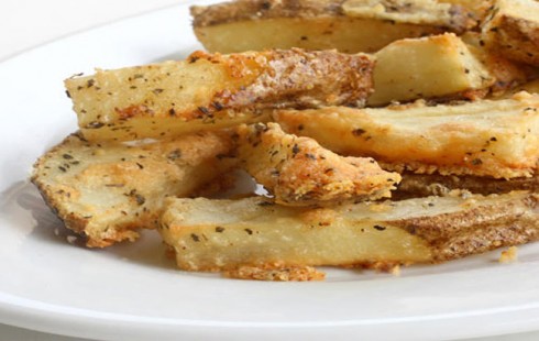 Κόβουμε τις πατάτες σε μακρόστενες φέτες (8 φέτες την κάθε πατάτα) και τις βουτάμε στο γάλα.