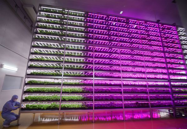 Πρόκειται για τη φουτουριστική φάρμα εσωτερικού χώρου της εταιρείας Mirai, επιφάνειας 2320 τετρ. μέτρων, όπου παράγονται 10.000 μαρούλια κάθε μέρα, υπό το φως17.500 λαμπτήρων LED που εκπέμπουν ένα απόκοσμο μωβ φως.