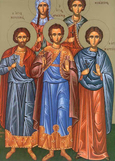 Ἀγωvισάμενοι καλῶς ἀπὸ βρέφους, Μαρκιανὲ σὺv τῷ σοφῷ Μαρτυρίῳ, τὸv ἀποστάτηv Ἄρειοv καθείλετε, ἄτρωτον τηρήσαντες, τὴν ὀρθόδοξοv πίστιν, Παύλῳ ἐφεπόμενοι, τῷ σοφῷ διδασκάλῳ, ὅθεν σὺv τούτῳ εὔρατε ζωήv, ὡς τῆς Τριάδος ὑπέρμαχοι ἄριστοι.