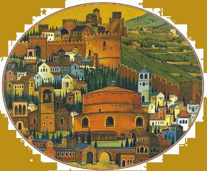 Στα χρόνια της βασιλείας των Βυζαντινών, η Θεσσαλονίκη ήτανε η δεύτερη Κωνσταντινούπολη. Μα κι από τα χρόνια των Ρωμαίων ήτανε πολύ τιμημένη, κι από τότε στέκεται ακόμα η αψίδα του Γαλερίου. Φαίνεται πως αυτού του ίδιου αυτοκράτορα μαυσωλείο ήτανε κι η παράξενη εκκλησία του Αγίου Γεωργίου, που θέλουνε να τη δώσουνε οι δικοί μας στους Τούρκους για να την κάνουνε τζαμί! Αυτό το σεβάσμιο χτίριο στέκεται χίλια εξακόσα πενήντα εφτά χρόνια.
