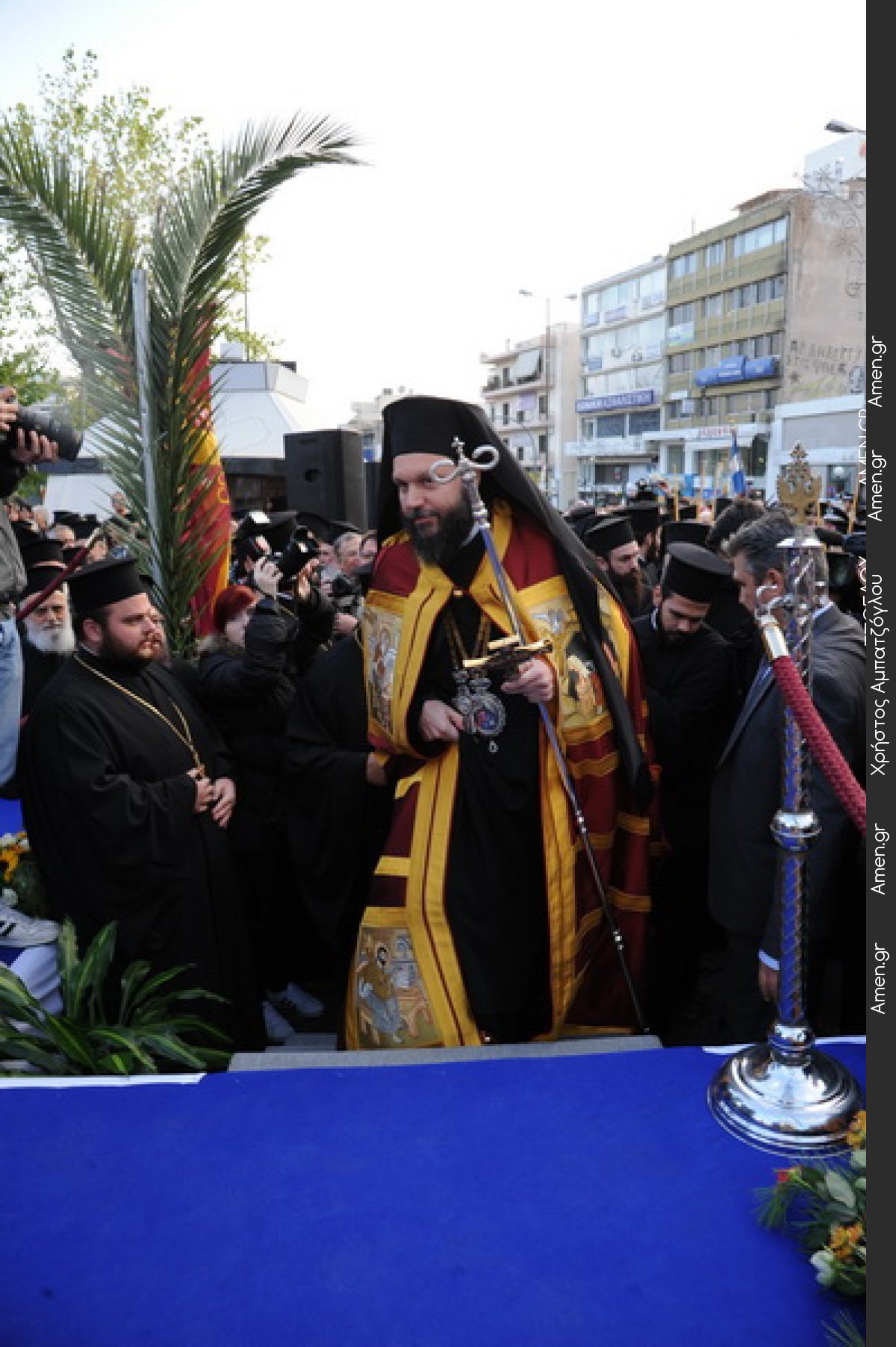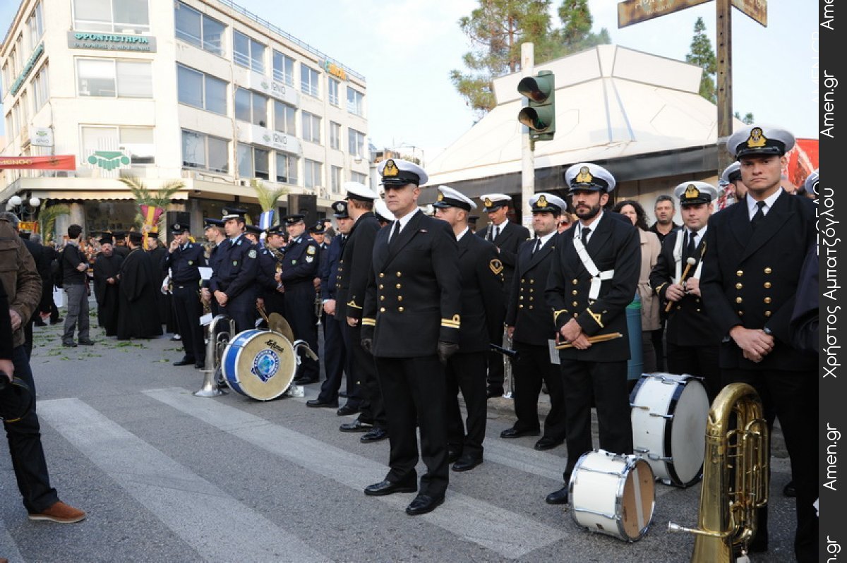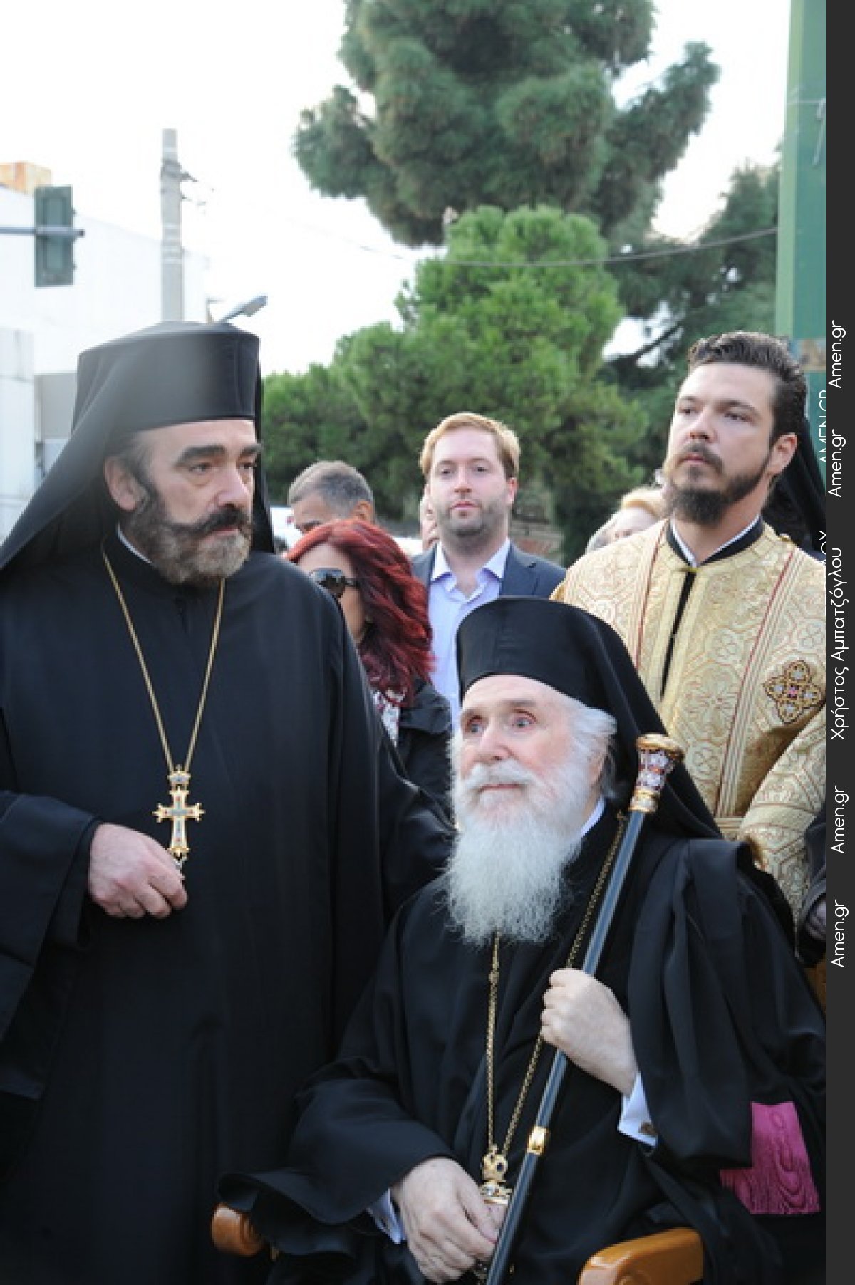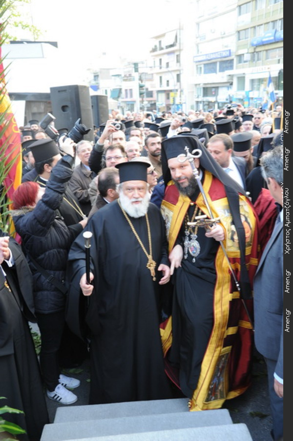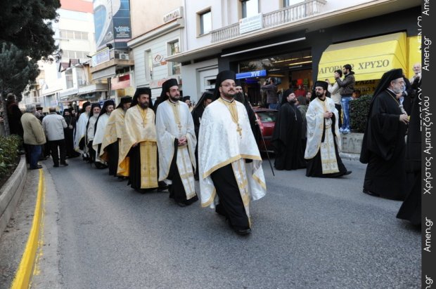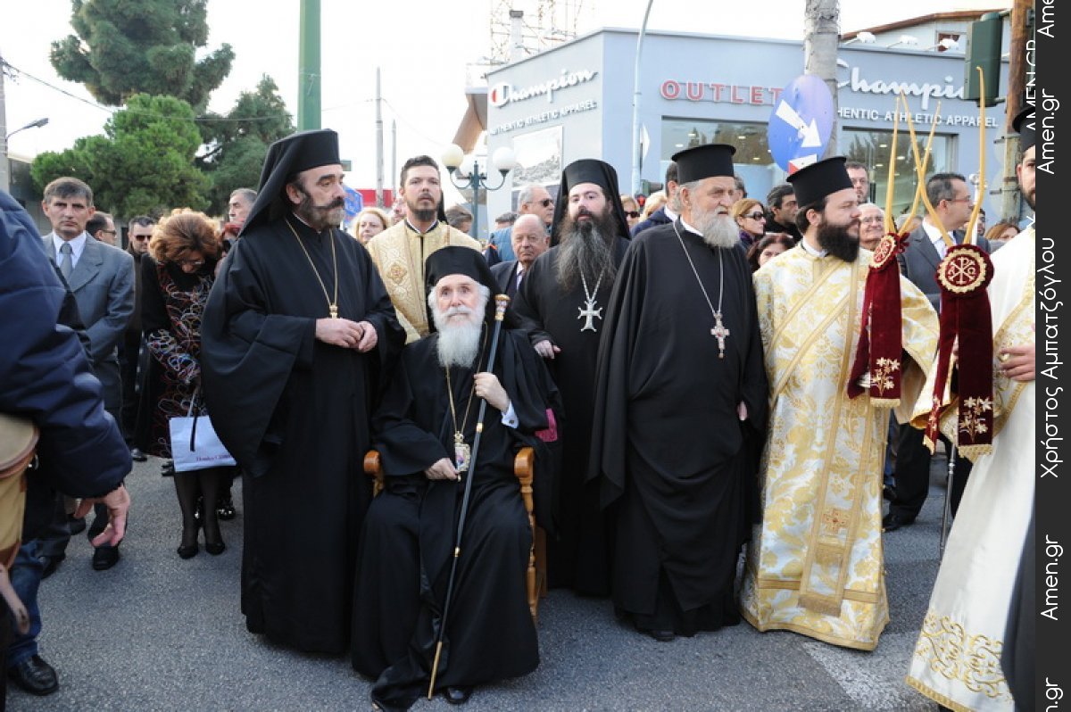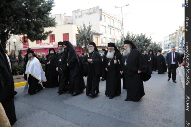 Αμέσως σχηματίστηκε η πομπή υπό την καθοδήγηση του τελετάρχου Πρωτοπρεσβ. Θωμά Συνοδινού, με προπορευόμενους Ιερόπαιδες, νέες και νέους με μικρασιατικές παραδοσιακές φορεσιές, αγήματα της Πολεμικής Αεροπορίας και της Σχολής Αστυφυλάκων, τον Ιερό Κλήρο της Μητροπόλεως και τους Ιεράρχες.