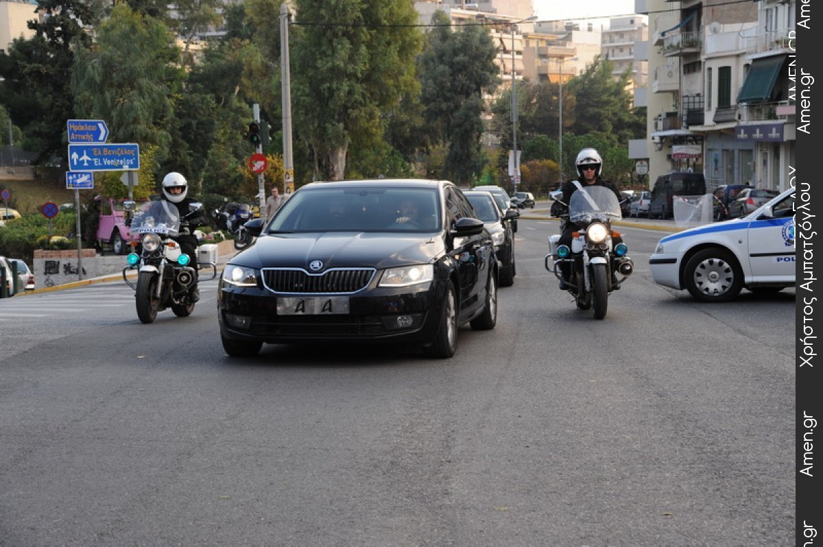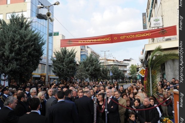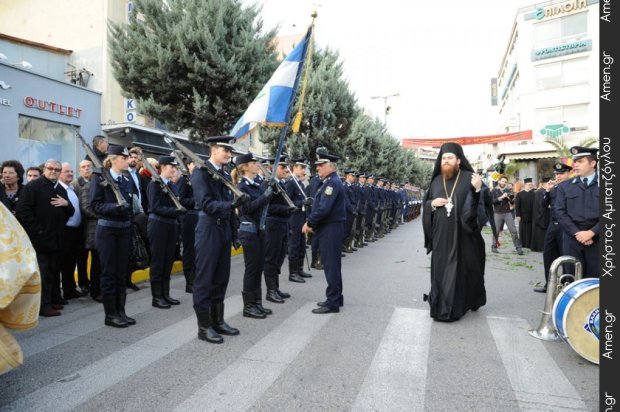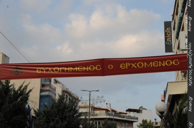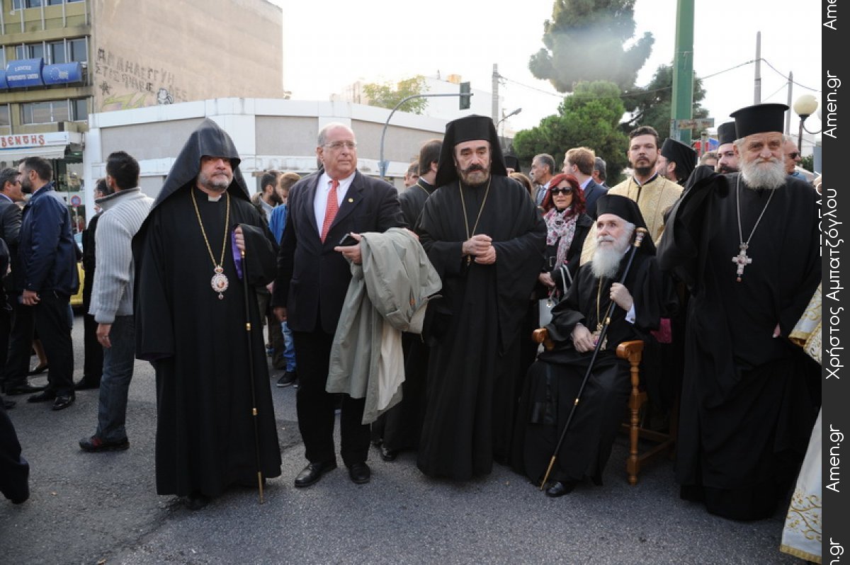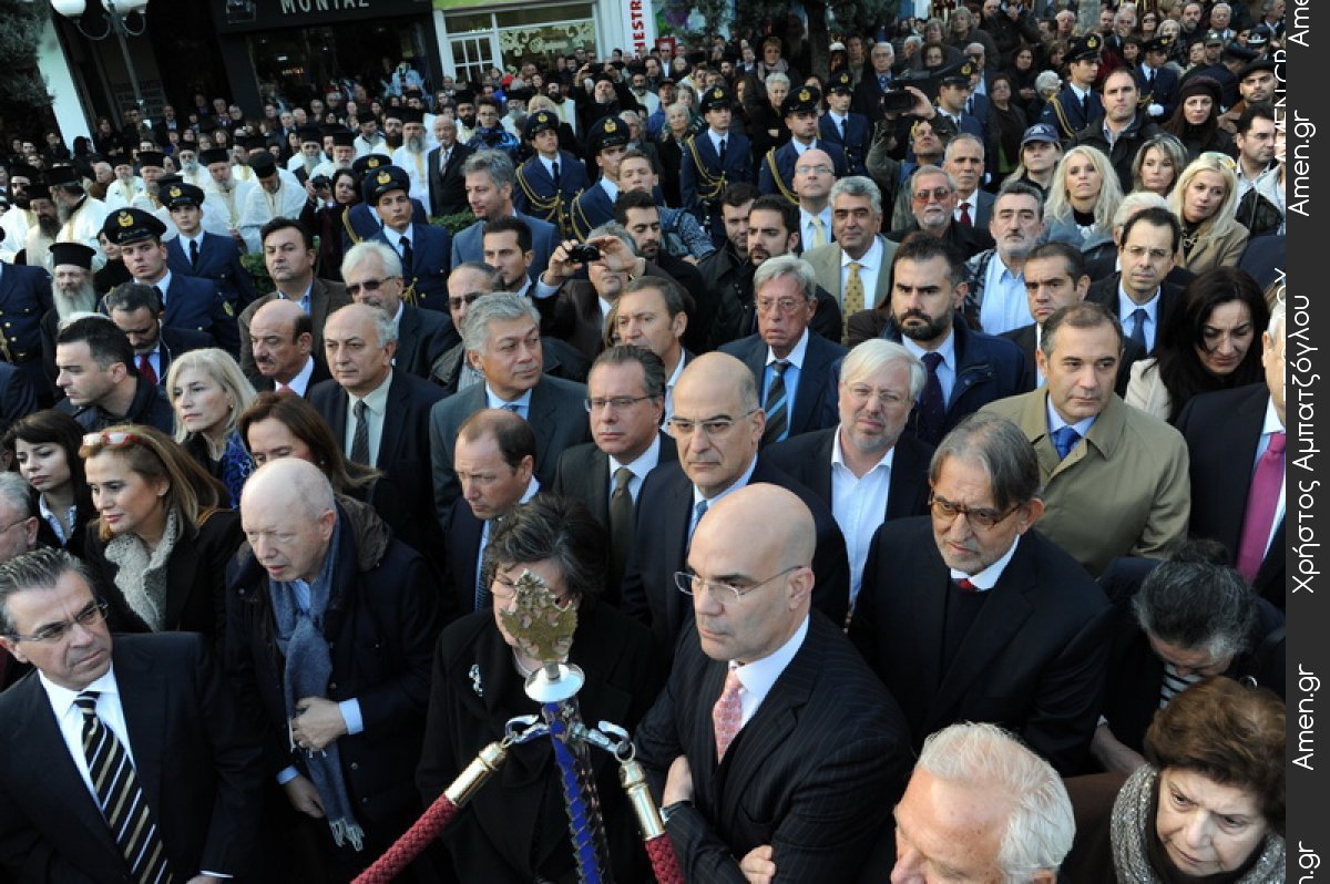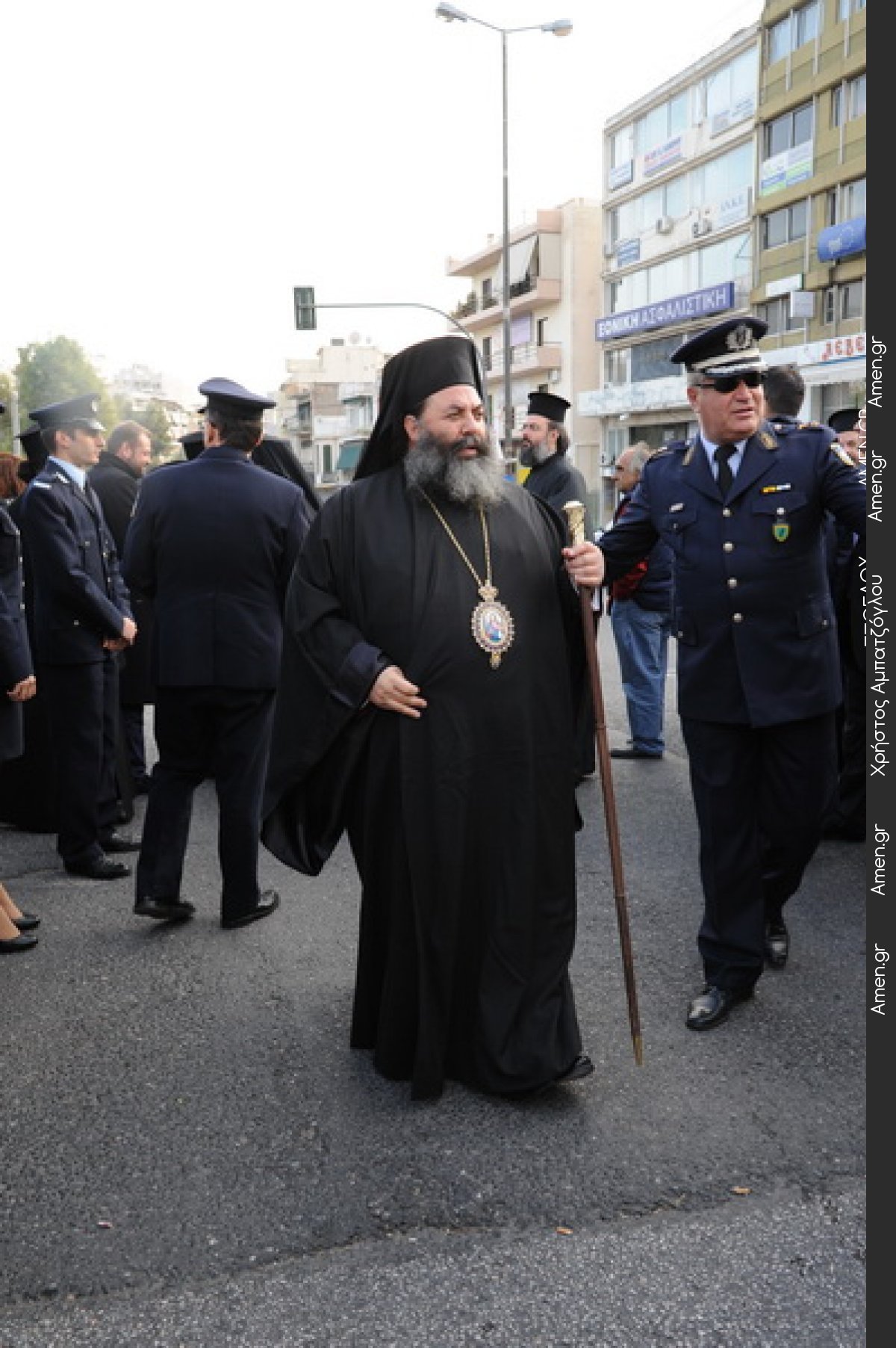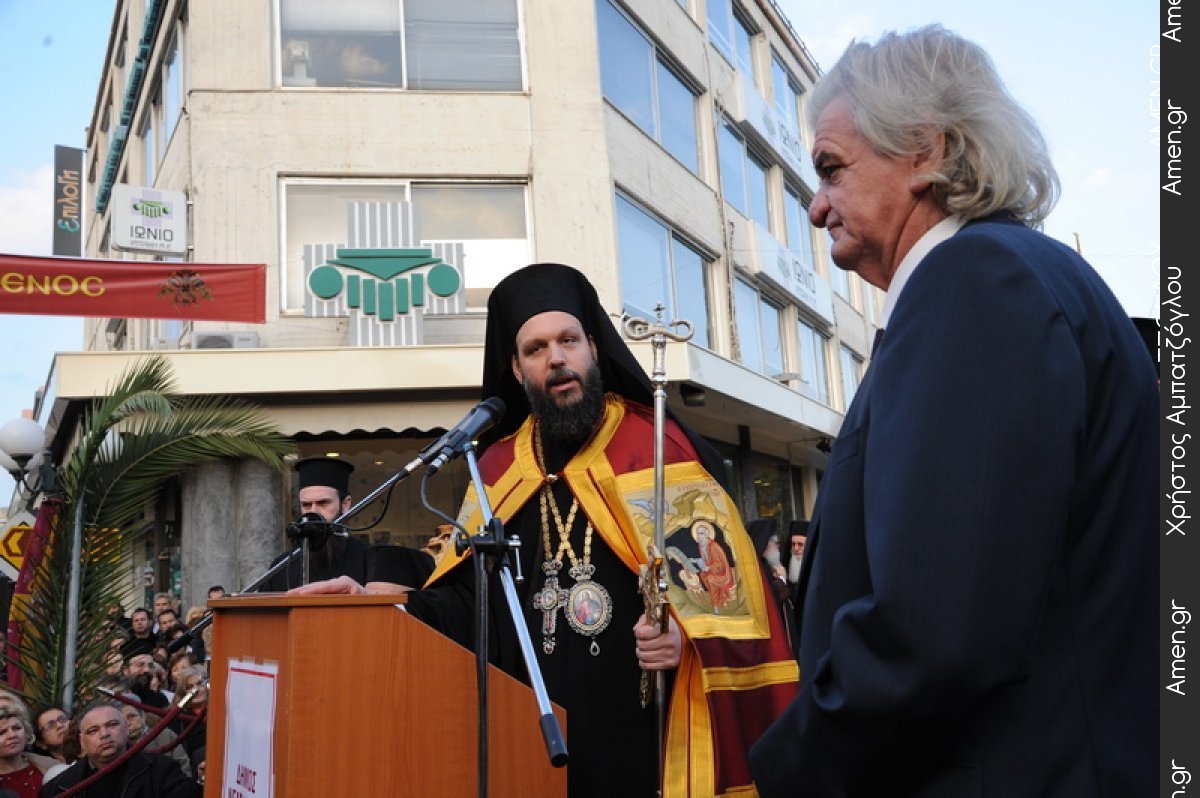 Αμέσως σχηματίστηκε η πομπή υπό την καθοδήγηση του τελετάρχου Πρωτοπρεσβ. Θωμά Συνοδινού, με προπορευόμενους Ιερόπαιδες, νέες και νέους με μικρασιατικές παραδοσιακές φορεσιές, αγήματα της Πολεμικής Αεροπορίας και της Σχολής Αστυφυλάκων, τον Ιερό Κλήρο της Μητροπόλεως και τους Ιεράρχες.