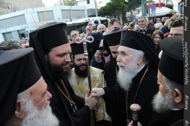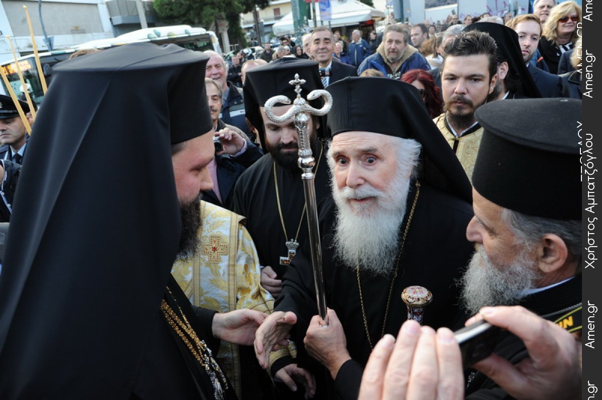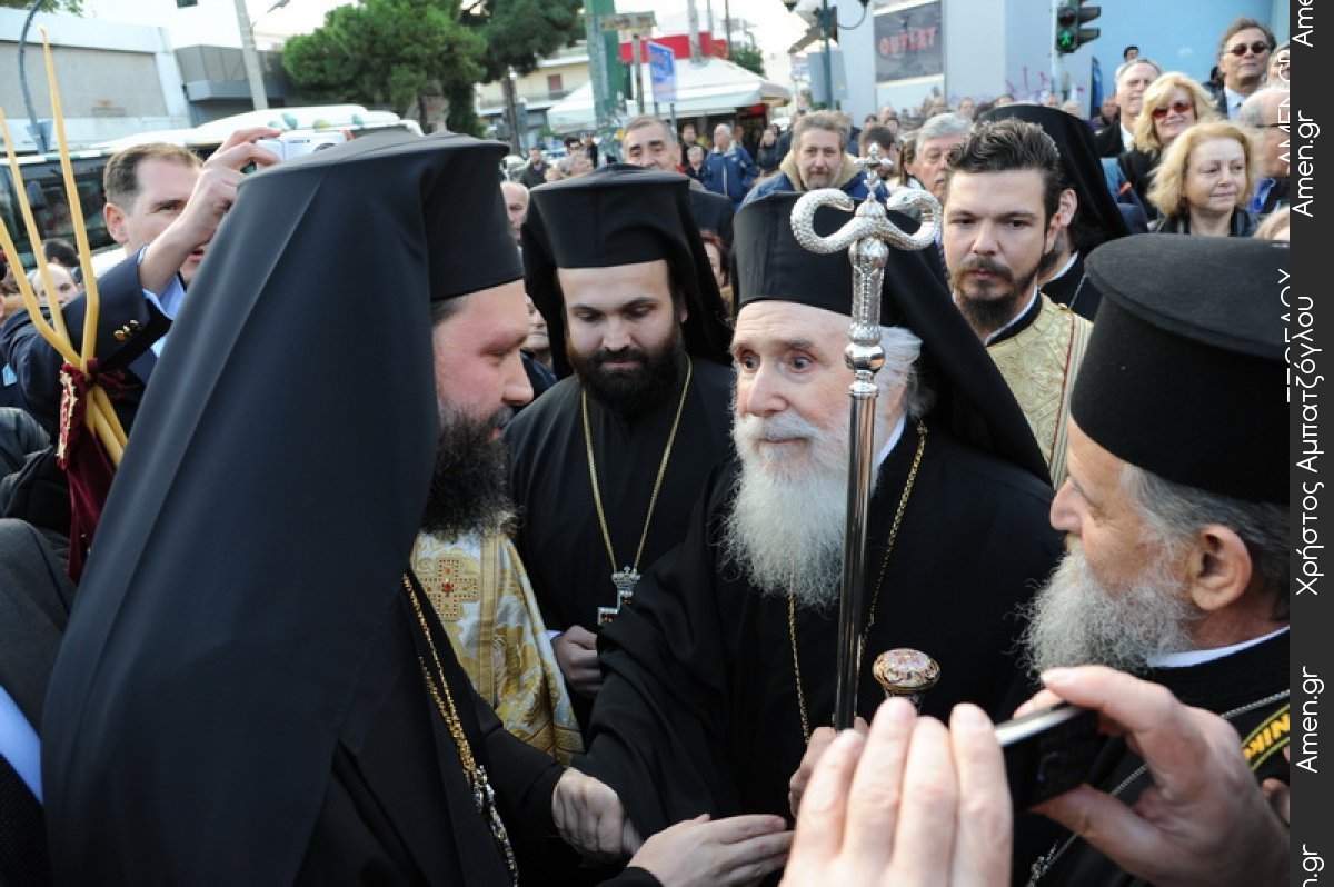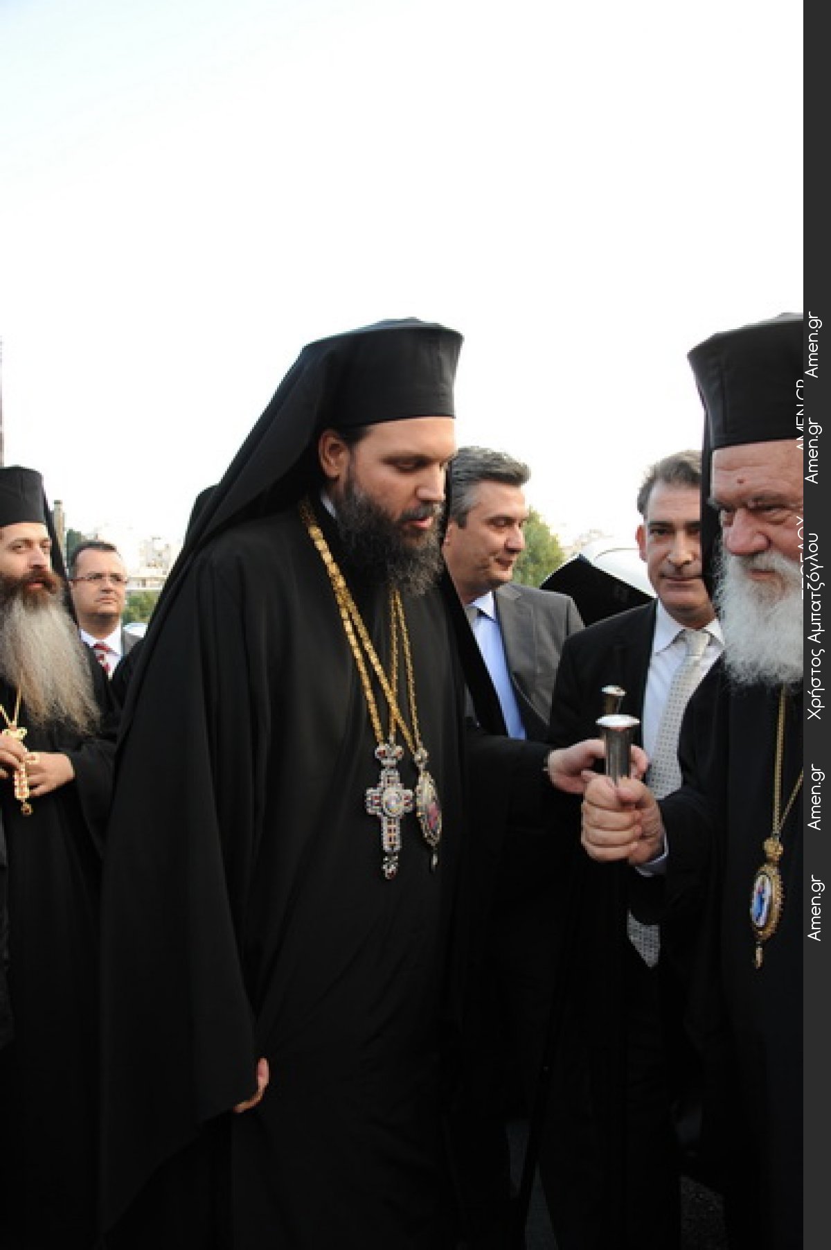 Προηγουμένως στην είσοδο της πόλεως ο τοποτηρητής της Μητροπόλεως, Μητροπολίτης πρώην Νέας Ιωνίας και Φιλαδελφείας Κωνσταντίνος, υποδέχθηκε το νέο Μητροπολίτη και διάδοχό του ο οποίος έφτασε προπεμπόμενος από τον Αρχιεπίσκοπο Αθηνών Ιερώνυμο, του οποίο Βοηθός Επίσκοπος υπήρξε έως της εκλογής του.