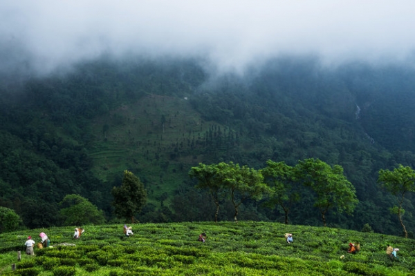 Οι εργαζόμενοι μεταφέρουν καλάθια στο χέρι, ανεβαίνουν σε μεγάλο υψόμετρο πολλές φορές και διαλέγουν προσεκτικά τα φύλλα του περίφημου τσαγιού Makaibari Tea Estate.