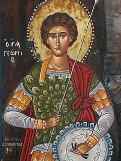 και αρρήκτως συνδεδεμένη προς αυτό μνήμη νέου την ηλικία στρατιωτικού αγίου είναι η τού Αγίου Γεωργίου, Μεγαλομάρτυρος και Τροπαιοφόρου, τού δημοφιλεστάτου νεαρού εφίππου Αγίου με σέβας ανάμεσα στους Χριστιανούς αλλά και Μουσουλμάνους: «Έαρ ημίν εξέλαμψεν η λαμπρά τού Δεσπότου και θεία εξανάστασις, προς ουράνιον Πάσχα εκ γής ημάς παραπέμπον· ταύτη δε συνεκλάμπει τού πανενδόξου μάρτυρος Γεωργίου η μνήμη η φωταυγής» (Εξαποστειλάριο, σε ήχο πλ. Β’).