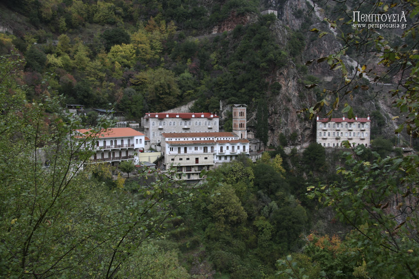 «Στάση θα γίνει στα Πατήματα της Παναγίας»! Τι στάση ευλογημένη ήταν αλήθεια αυτή; Ψάλλαμε με την καρδιά μας, όλοι μαζί, πράγματι «εν ενί στόματι και μια καρδία». Το ψύχος γινόταν όλο και πιο δυνατό, γιατί βρισκόμασταν πλέον παράλληλα στο ποτάμι, που είχε ξεκινήσει μια συναυλία παφλασμών. Η κούραση σε λίγο δεν έδινε πλέον καμμία δυνατότητα για συζήτηση. Ο καθένας μόνος, δεόμενος, δίνοντας κουράγιο στον εαυτό του, προχωρούσε. Στα τελευταία χιλιόμετρα μια ανηφόρα που δεν είχαμε υπολογίσει. Έβαλαν όλοι, όλες τις δυναμείς τους και κάποια στιγμή, το αυτοκίνητο που μας συνόδευε, είδε στην ένδειξη του ταμπλό τον τερματισμό της απόστασης, λέγοντας: «δύο χιλιόμετρα ακόμα». Πήραμε θάρρος! Προχωρούσαμε μέσα στο απόλυτο σκοτάδι. Έχουν δημιουργηθεί τώρα πολλές ξεχωριστές ομάδες, άλλοι, βέβαια, εντελώς μόνοι, ανάλογα με τις αντοχές του ο καθένας. Σε λίγο, ακούσαμε ψαλμωδίες, ήταν από τα μεγάφωνα της μονής. Δεν άργησε να δούμε και το μοναστήρι μέσα στη χαράδρα. « Νυν απολύεις τον δούλο σου εν ειρήνη, ότι είδον οι οφθαλμοί μου το σωτήριον σου…». Φθάσαμε, στο προαύλιο της μονής και κάποιος πρότεινε: «Πάμε μπούσουλα στην Παναγία;».