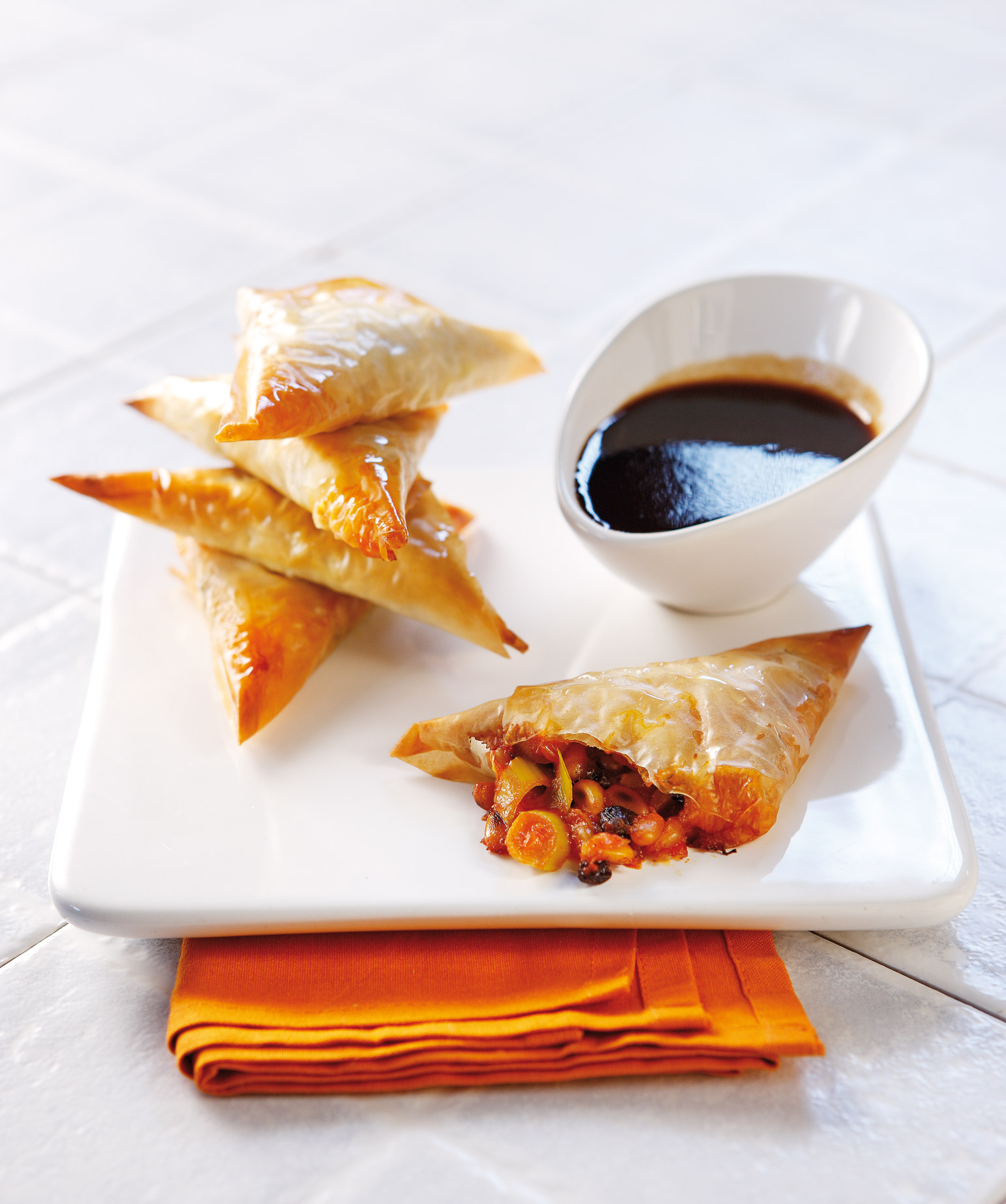 Βάζετε τα φύλλα στον πάγκο σας και με τρεις κάθετες χαρακιές τα κόβετε σε τέσσερις λωρίδες το καθένα. Στην άκρη κάθε λωρίδας ακουμπάτε από μία κουταλιά της σούπας γέμιση και τα τυλίγετε φτιάχνοντας όμορφα τριγωνάκια τα οποία αραδιάζετε σε ταψί στρωμένο με χαρτί ψησίματος. Τα αλείφετε με λίγο λάδι και τα ψήνετε στον φούρνο μέχρι να ροδοκοκκινίσουν από όλες τις πλευρές.