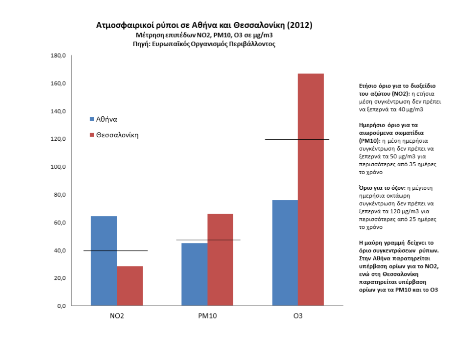 Ο Ευρωπαϊκός Οργανισμός Περιβάλλοντος διατηρεί βάση δεδομένων με τις συγκεντρώσεις αέριων ρύπων σε μεγάλες πόλεις της Ευρώπης. Πρόσφατα τα δεδομένα ανανεώθηκαν και πλέον περιλαμβάνουν τις πιο πρόσφατες μετρήσεις που αφορούν το έτος 2012. Η WWF – Καλύτερη Ζωή βρήκε τις μετρήσεις για τις δυο μεγάλες πόλεις της Ελλάδας, την Αθήνα και τη Θεσσαλονίκη, και τις παραθέτει. Οι μετρήσεις αφορούν το διοξείδιο του αζώτου (ΝΟ2), τα αιωρούμενα σωματίδια (PM10) και το όζον (O3). Δυστυχώς η Ελλάδα ακόμα δεν μετρά ή δεν παραθέτει αξιόπιστα δεδομένα και για άλλους σημαντικούς ρύπους όπως τα πολύ μικρά αιωρούμενα σωματίδια (PM2,5) και το καρκινογόνο Βενζο[a]πυρένιο. Οι μετρήσεις για το διοξείδιο του αζώτου, τα αιωρούμενα σωματίδια και το όζον δεν είναι καλές. Στην Αθήνα παρατηρείται υπέρβαση των ορίων για το διοξείδιο του αζώτου, ενώ στη Θεσσαλονίκη παρατηρούνται υπερβάσεις στα όρια των αιωρούμενων σωματιδίων και του όζοντος.